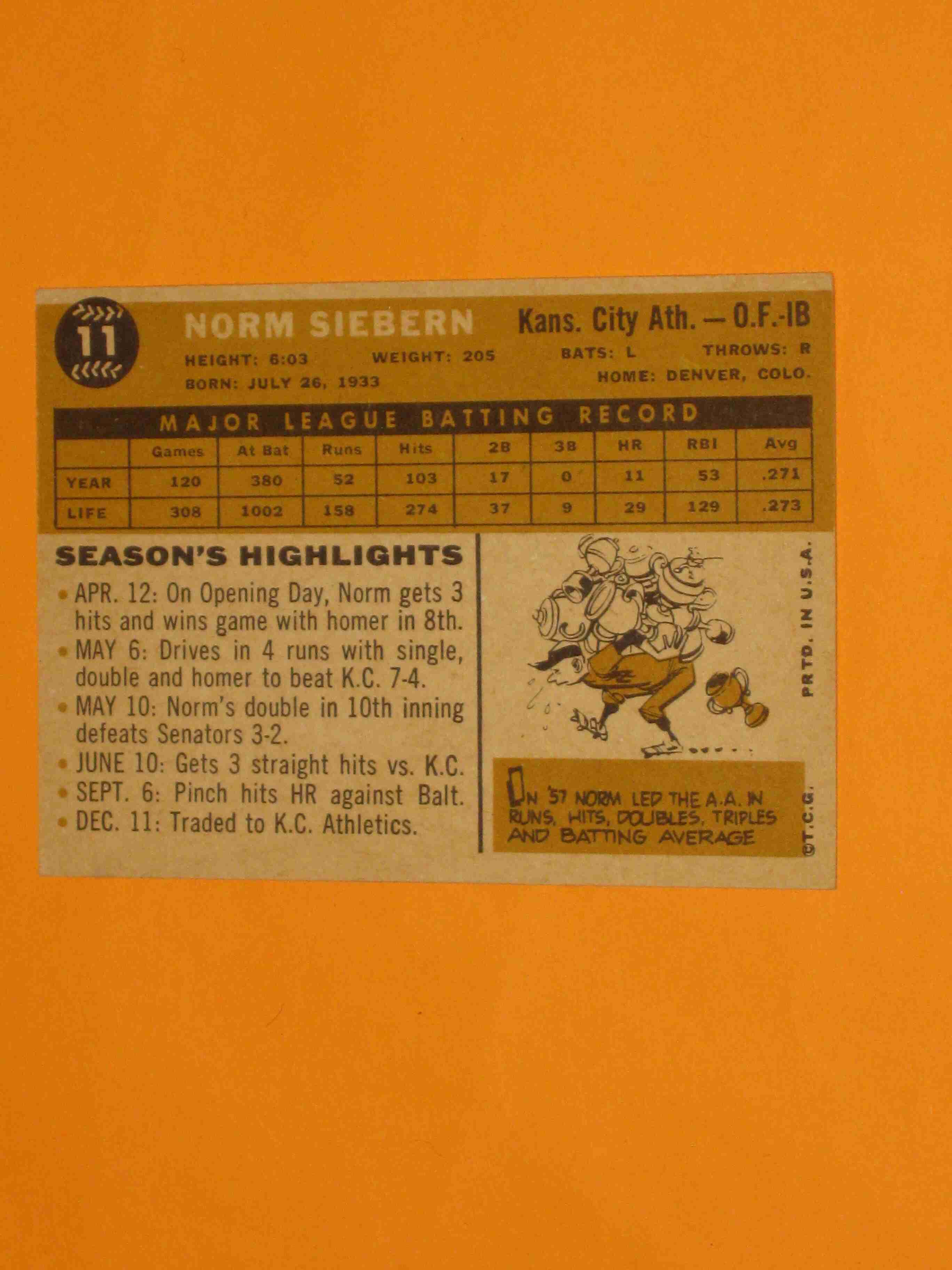 1960 Topps Norm Siebern #11 Kansas City Athletics