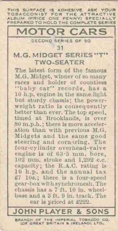 1937 Player's Motor Cards #31 M.G. Midget Series "T"