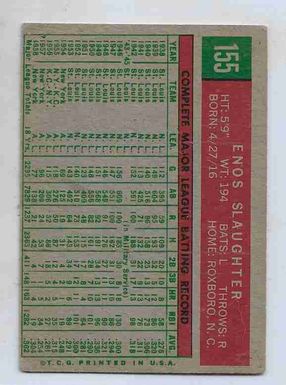 1959 Topps #155 ~ Enos Slaughter New York Yankees HOF
