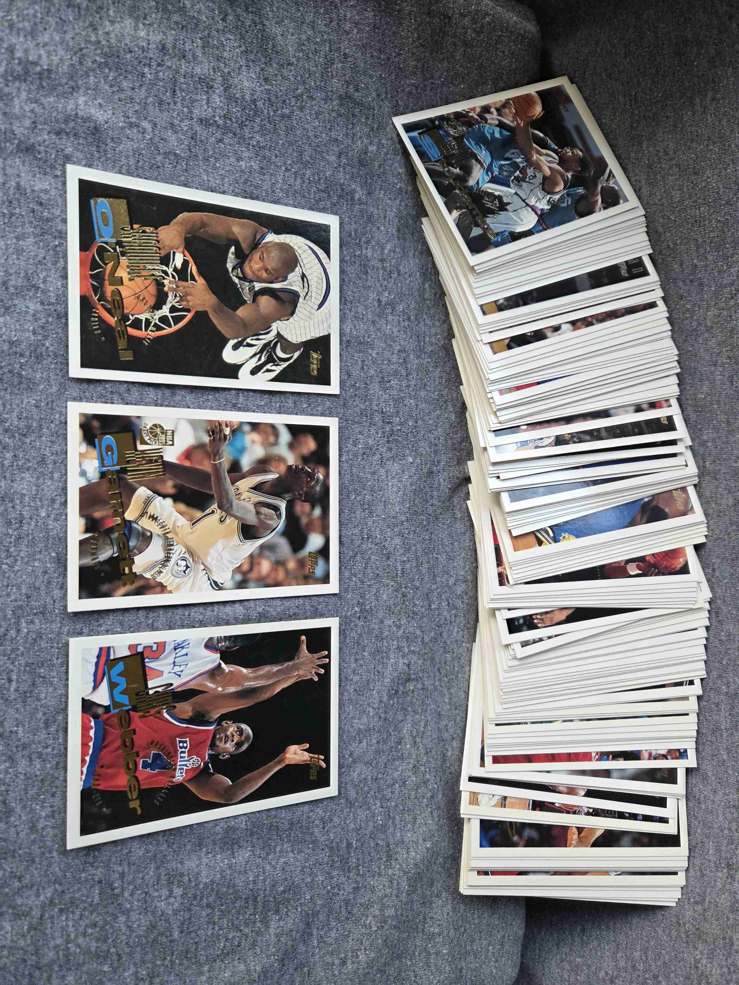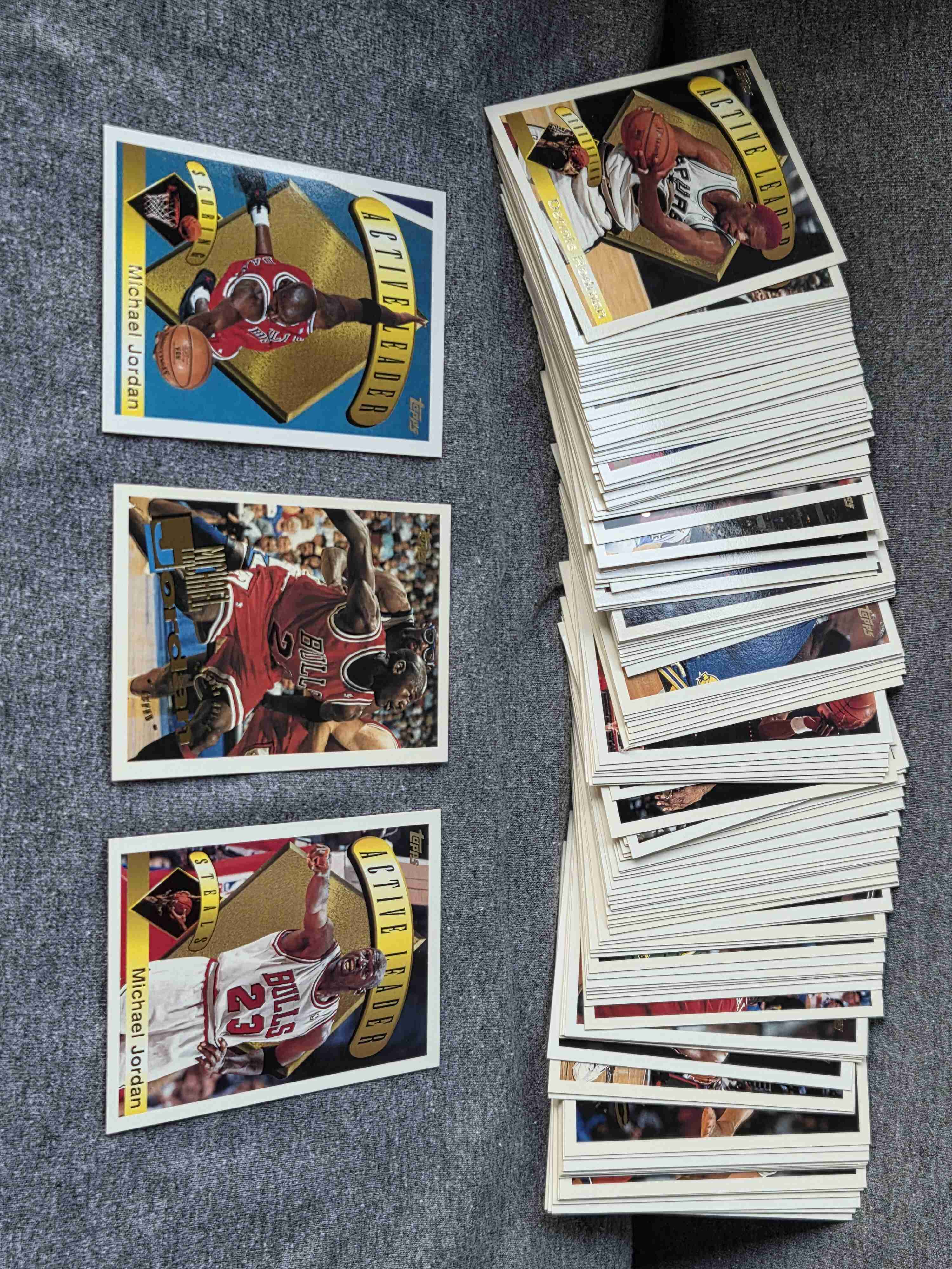 Time to thin out some sets from my collection! Keep watching Sportlots auctions as I’ll be putting sets up for bid each week – different sports, different years, different price points – in other words, something for everyone. ... Let's welcome back basketball season by offering up Topps' flagship brand from 1995-96 (complete at 291 cards). ... Jordan had returned from his "retirement" and there are several cards of him in this set. Garnett is the top RC. Plenty of all-stars, too, including Shaq, Penny, Barkley, Ewing, Malone, Hill, Rodman, Payton, etc. ...... Quick and secure shipping (from USA) from a veteran Sportlots seller with 100% positive feedback. Good luck bidding!