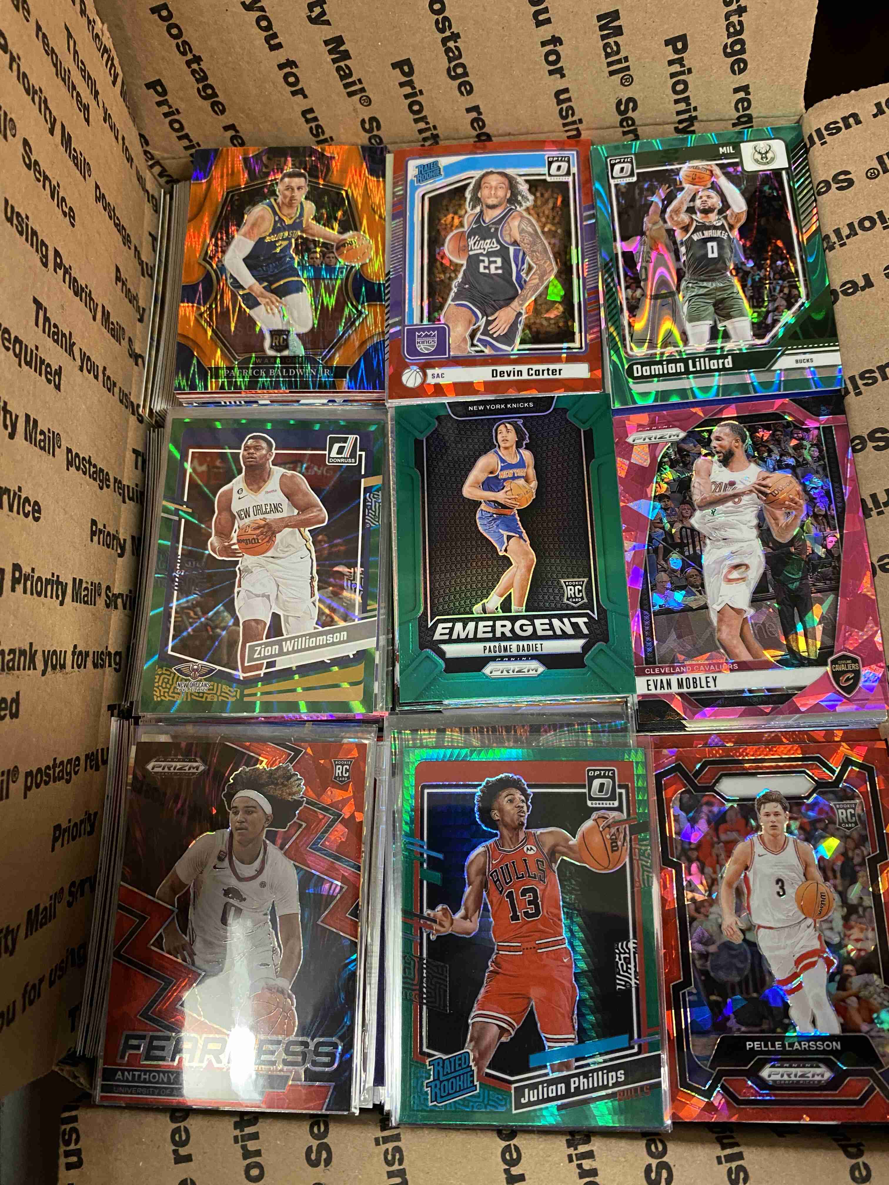 Medium flat rate box filled with rookies, inserts, and parallels. There is no veteran base in this box. Cards are mostly from the past five seasons. Comes double boxed to add protection from shipping. Thank you for your interest in my listing.