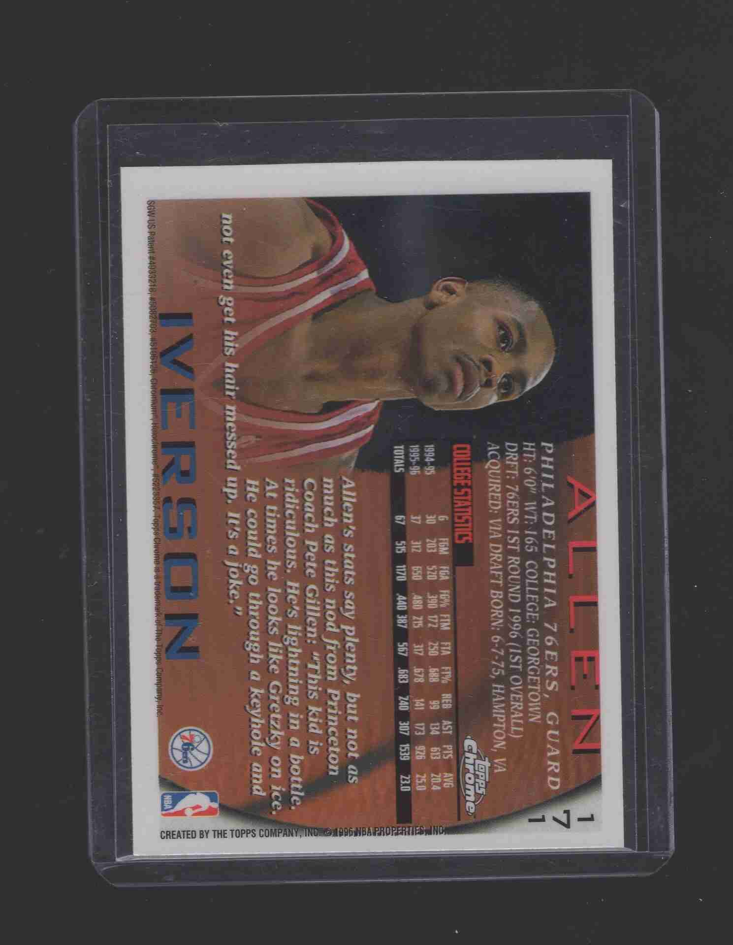 Allen Iverson 1996-97 Topps Chrome Rookie #171. Card ships bubble mailer with tracking. Check out our other items to help manage shipping costs.