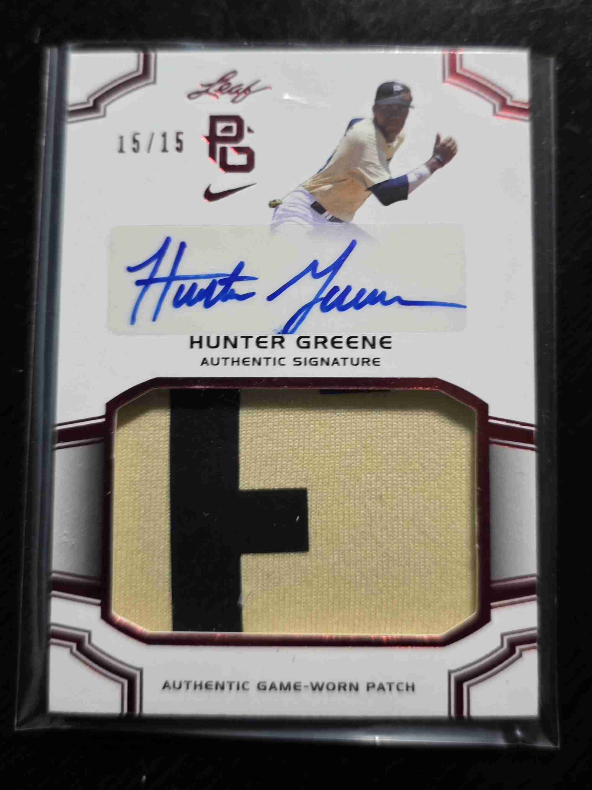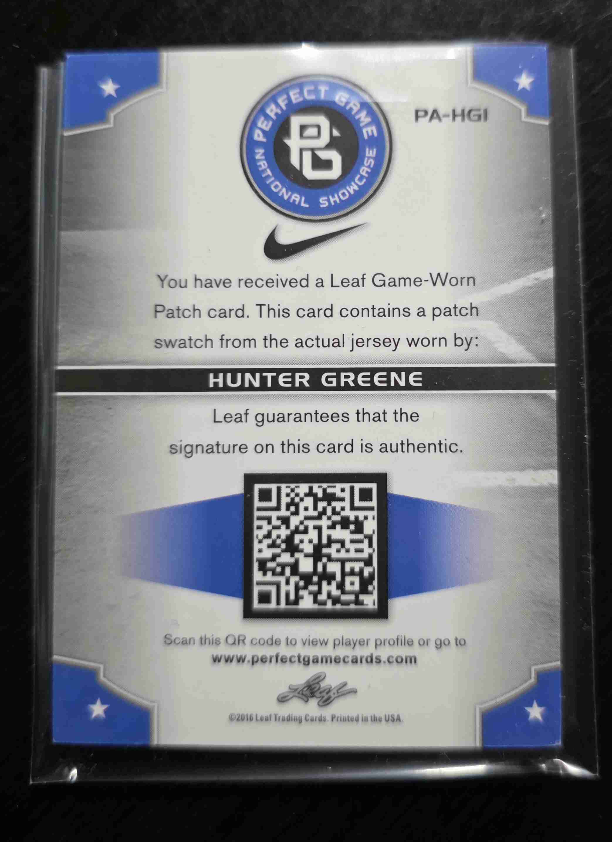 2016 Leaf Perfect Game Hunter Greene 15/15 Game Worn Patch Auto. Card is in Nr-Mt condition.