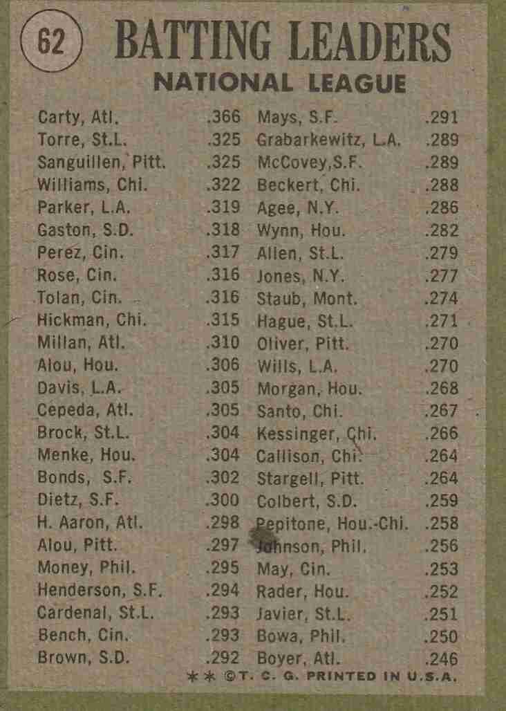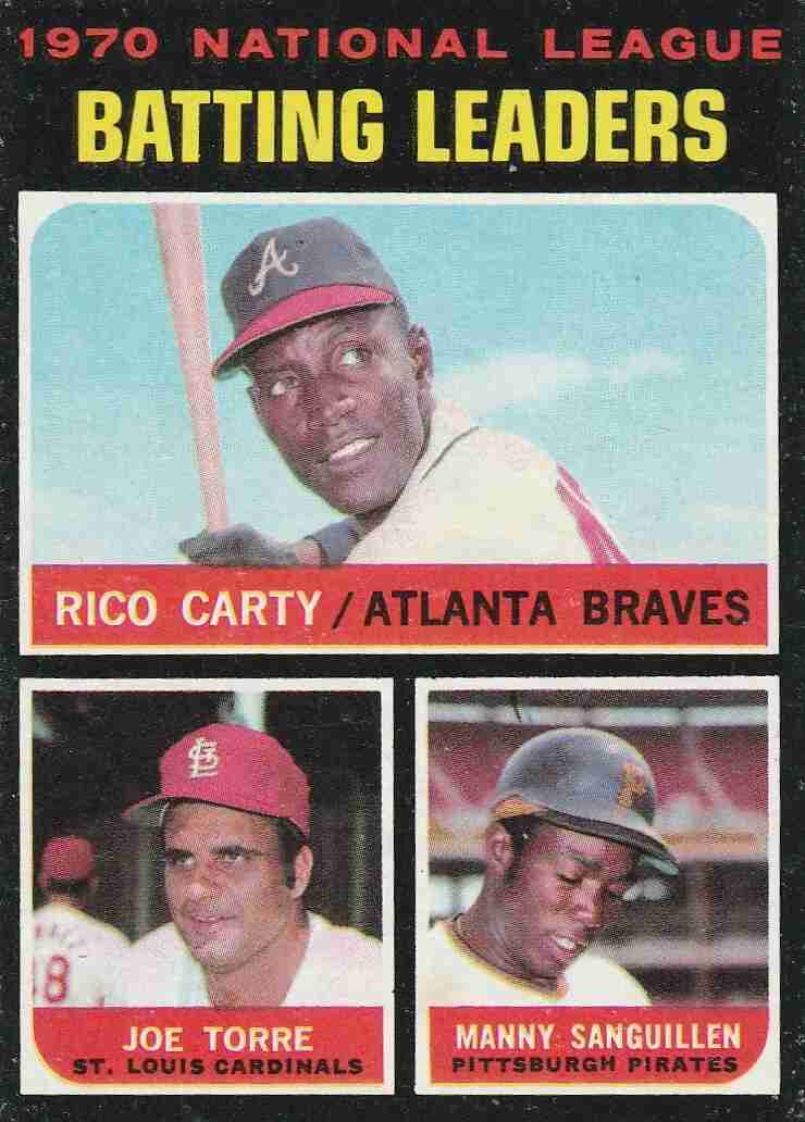 #61 1970 AL Batting Johnson-Yaz-Oliva (EX/NM) #62 1970 NL Batting Carty-Torre-Sanguillen (EX/NM) spot on back