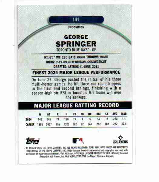 GEORGE SPRINGER - 2025 TOPPS FINEST - 162/250