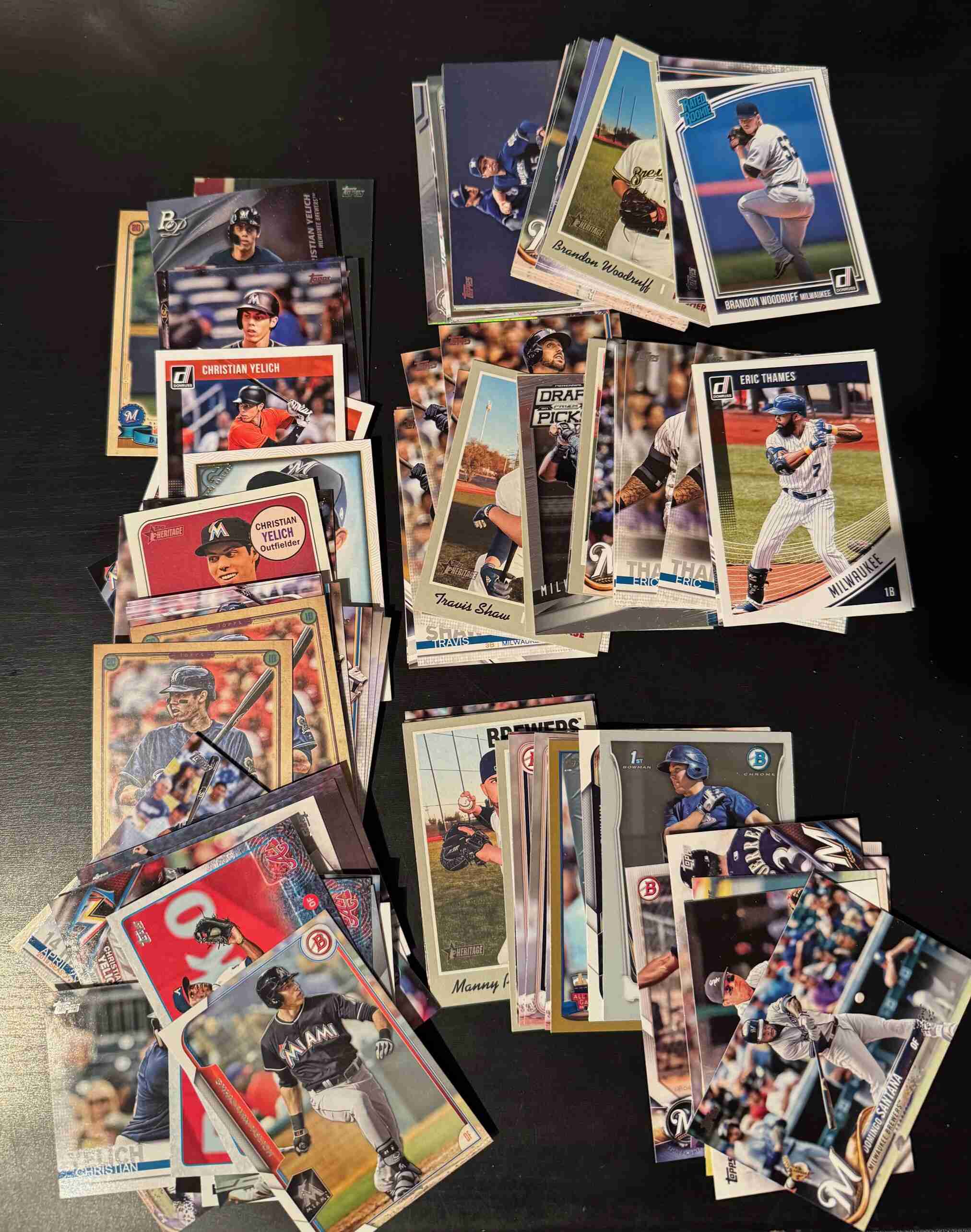 This is a large lot of over 400 baseball cards featuring players associated with the Milwaukee Brewers franchise. Great lot for team collectors or card dealers/resellers. Most cards will be players who are depicted in Milwaukee Brewers uniforms/logo on the card, but some cards are players who were associated with the team at some recent point in time but are shown as associated with other teams. Some rookie cards, inserts, and parallels may be included in the lot. See photos for some examples of what is included in the lot. Examples of players included in the lot are: Jesus Aguilar, Ryan Braun, Lorenzo Cain, Josh Hader, Keston Hiura, Corey Knebel, Jonathan Lucroy, Brice Turang, Jonathan Villar, Christian Yelich, and MORE.