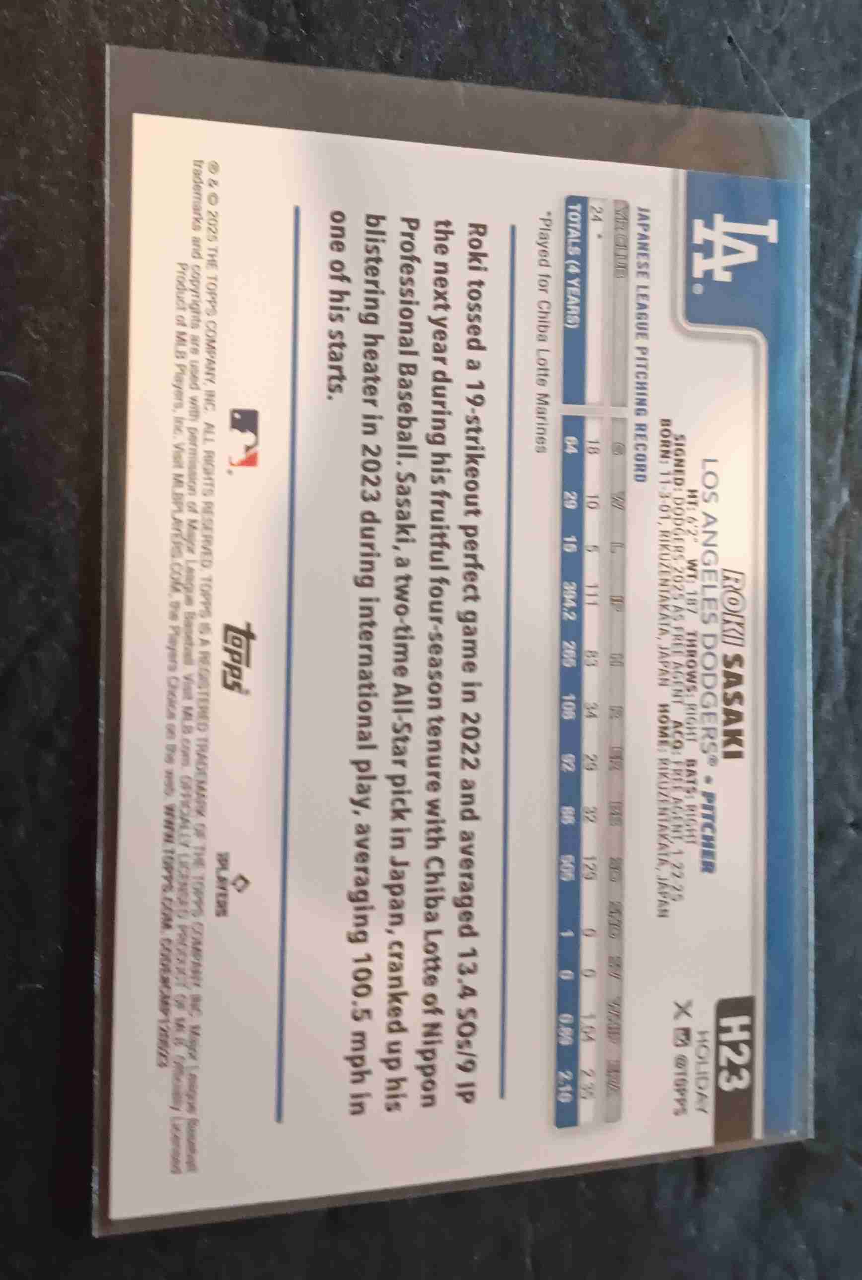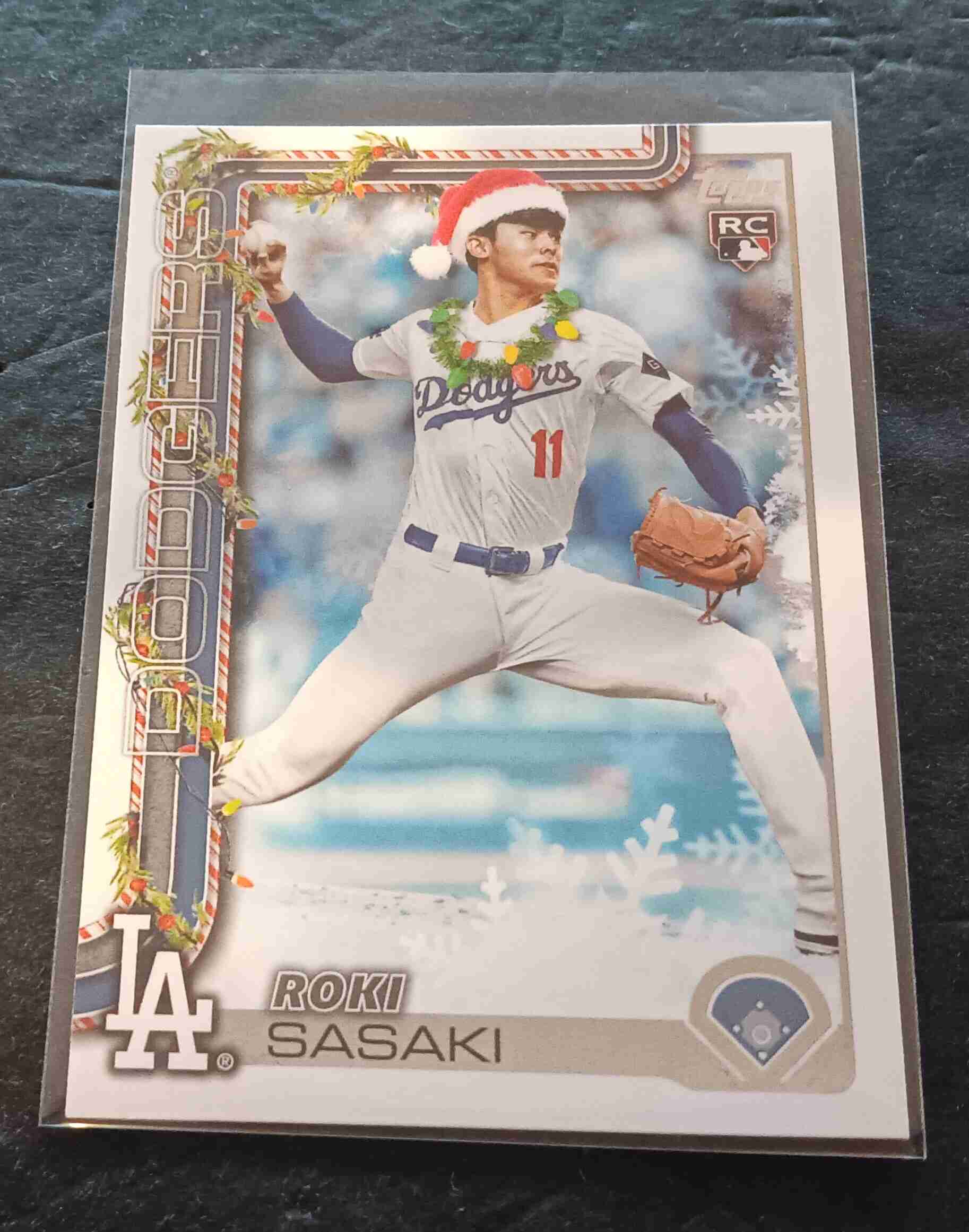 This auction is for a 2025 Topps Holiday Roki Sasaki RC Santa Hat Parallel.Card is number H23,and is in NM condition.Thanks for looking.