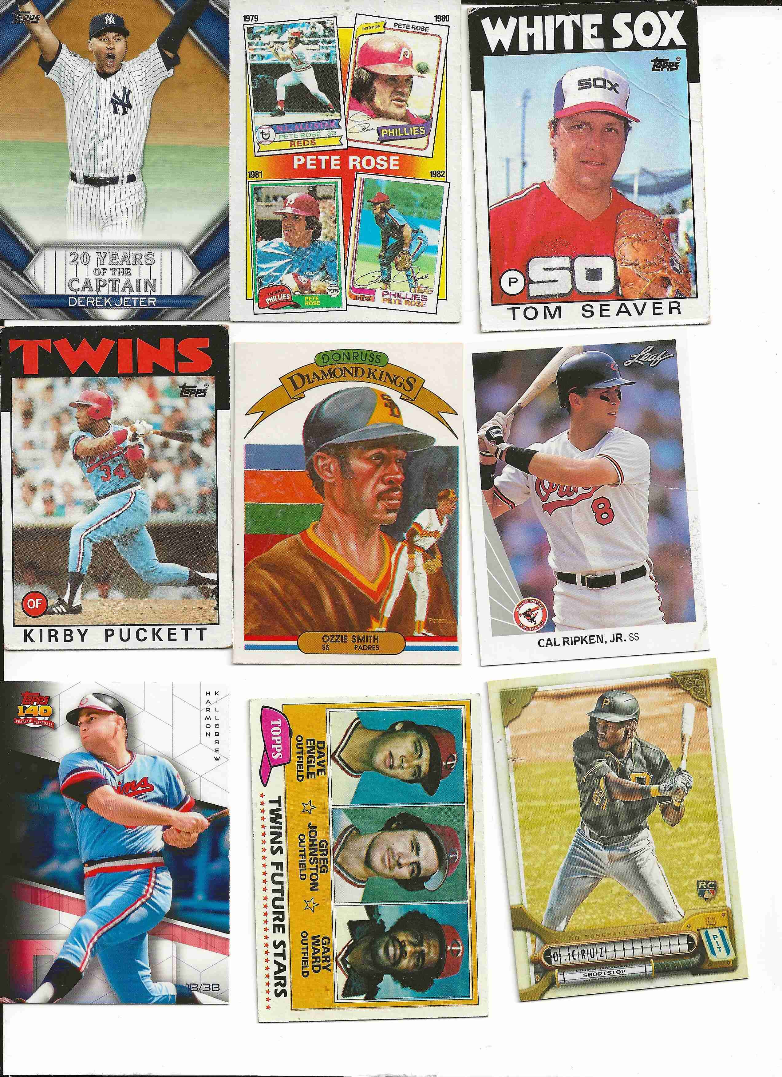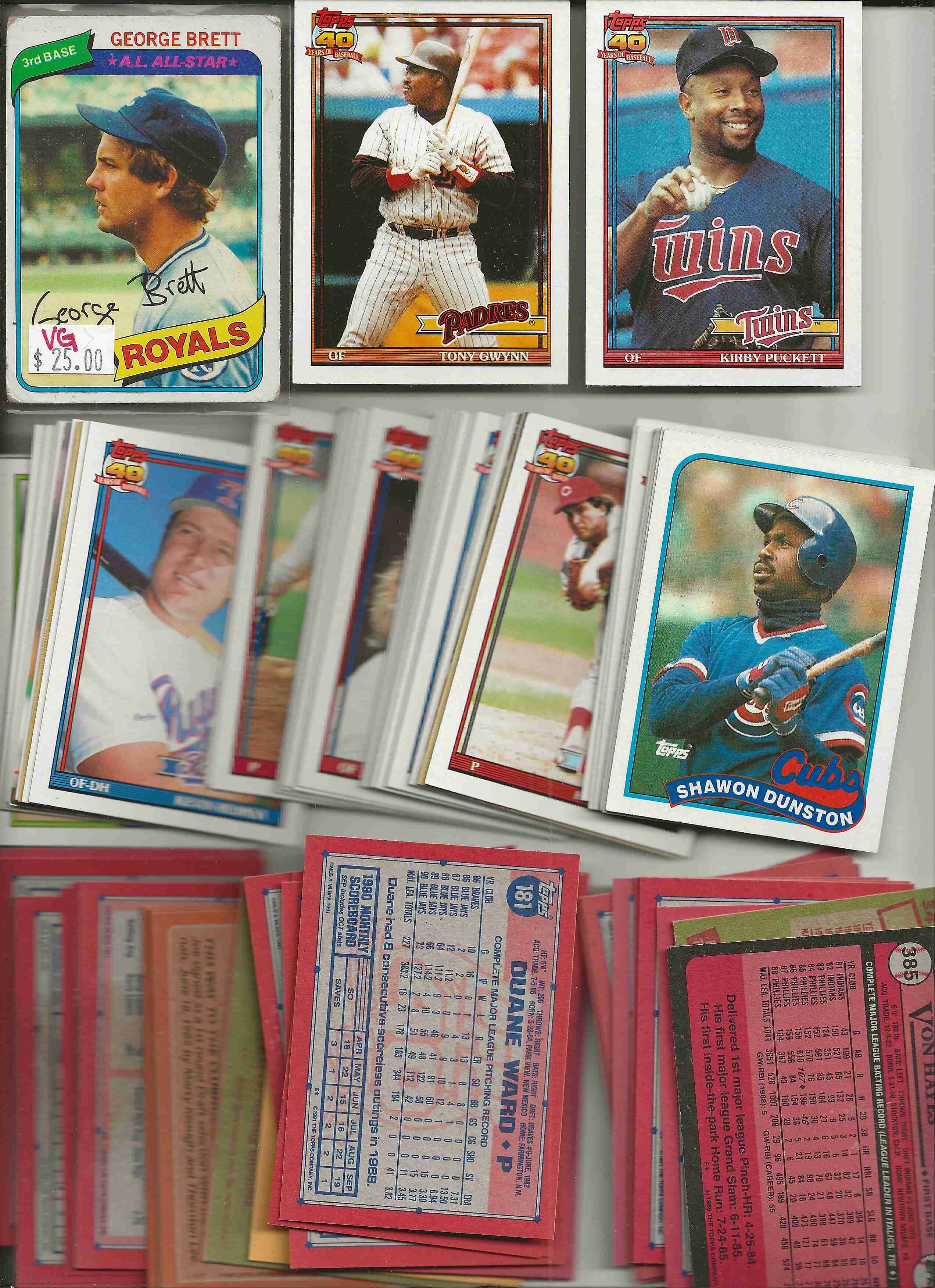 Consider all cards VG. Vg cards are creased, waxed or marked with inks. Some may be poor used only for fillers. Contains a large amount of 1991 Topps with wax on back. Some stars. Added another card 1980 Topps George Brett VG BV $25.00. Shipped with USPS tracking