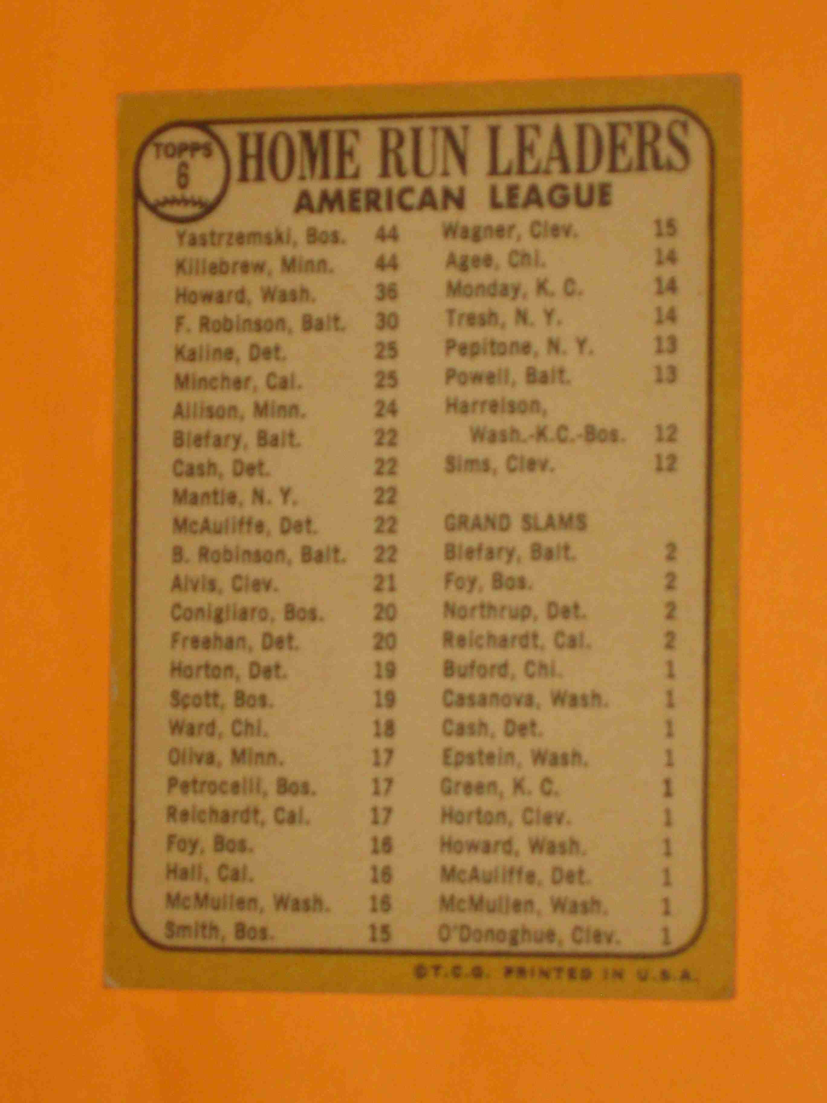 1968 Topps AL HR Ldrs #6 Yaz Killebrew Howard