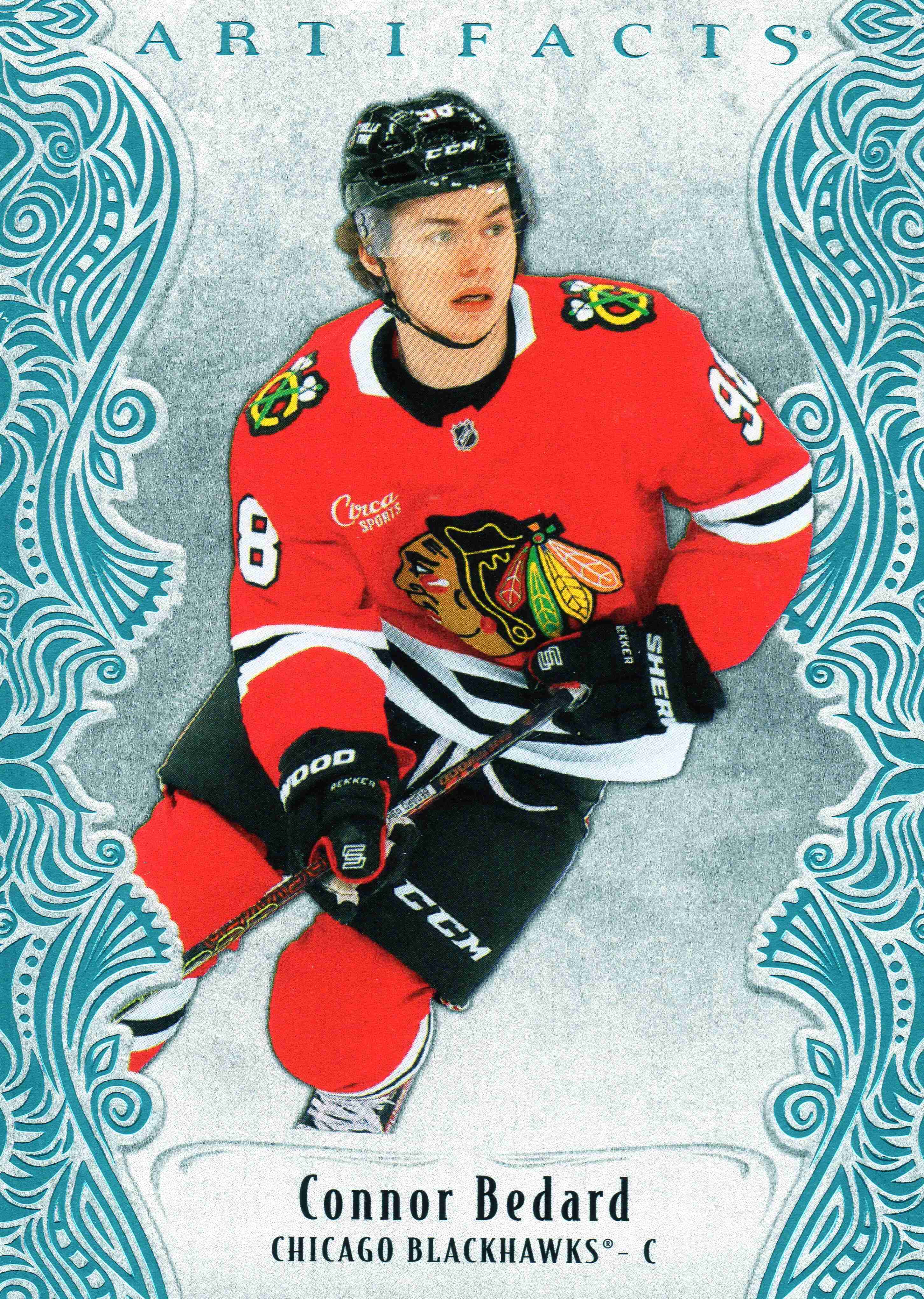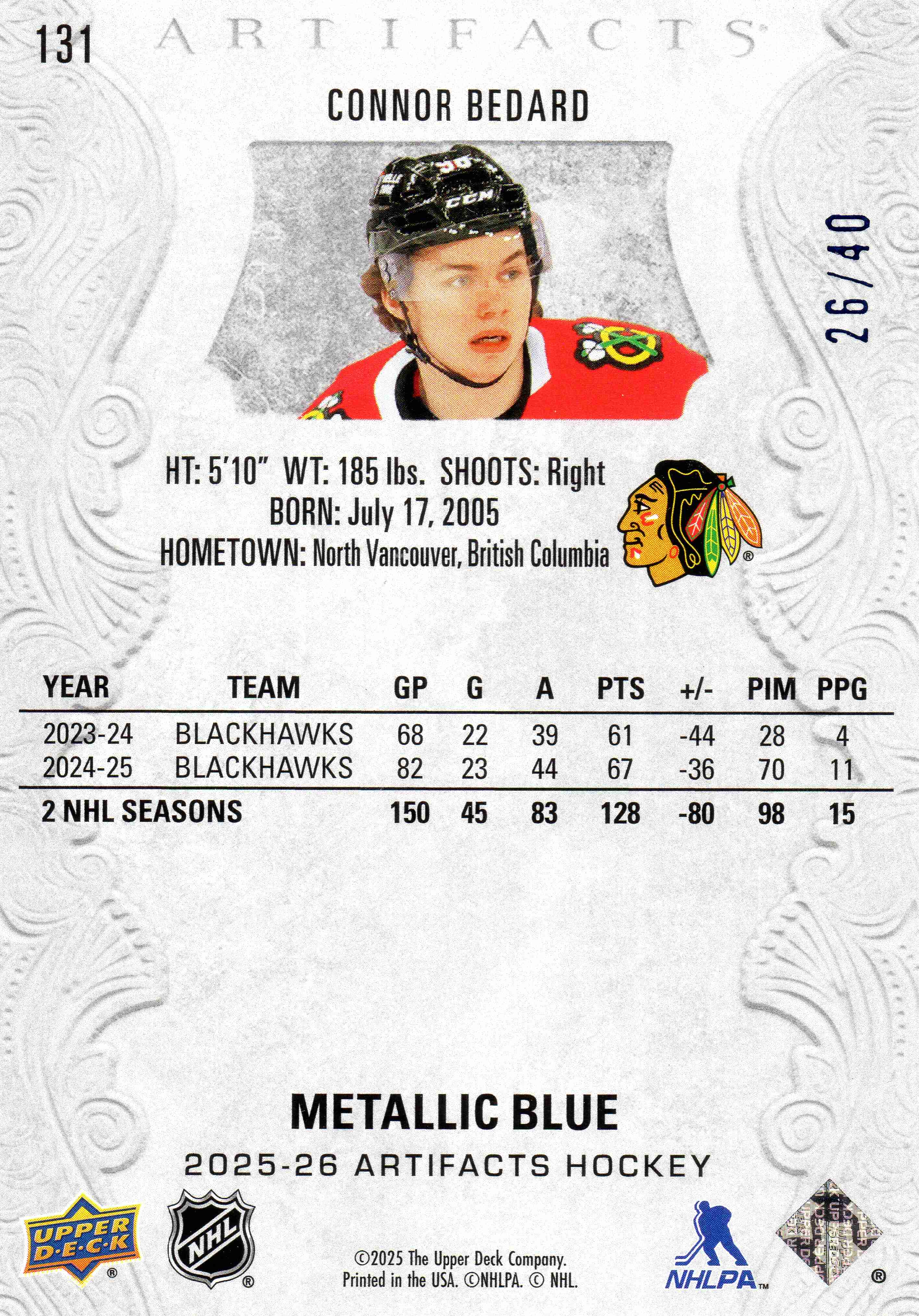 Connor Bedard 2025 Artifacts Metallic Blue #131. Further numbered 26/40.