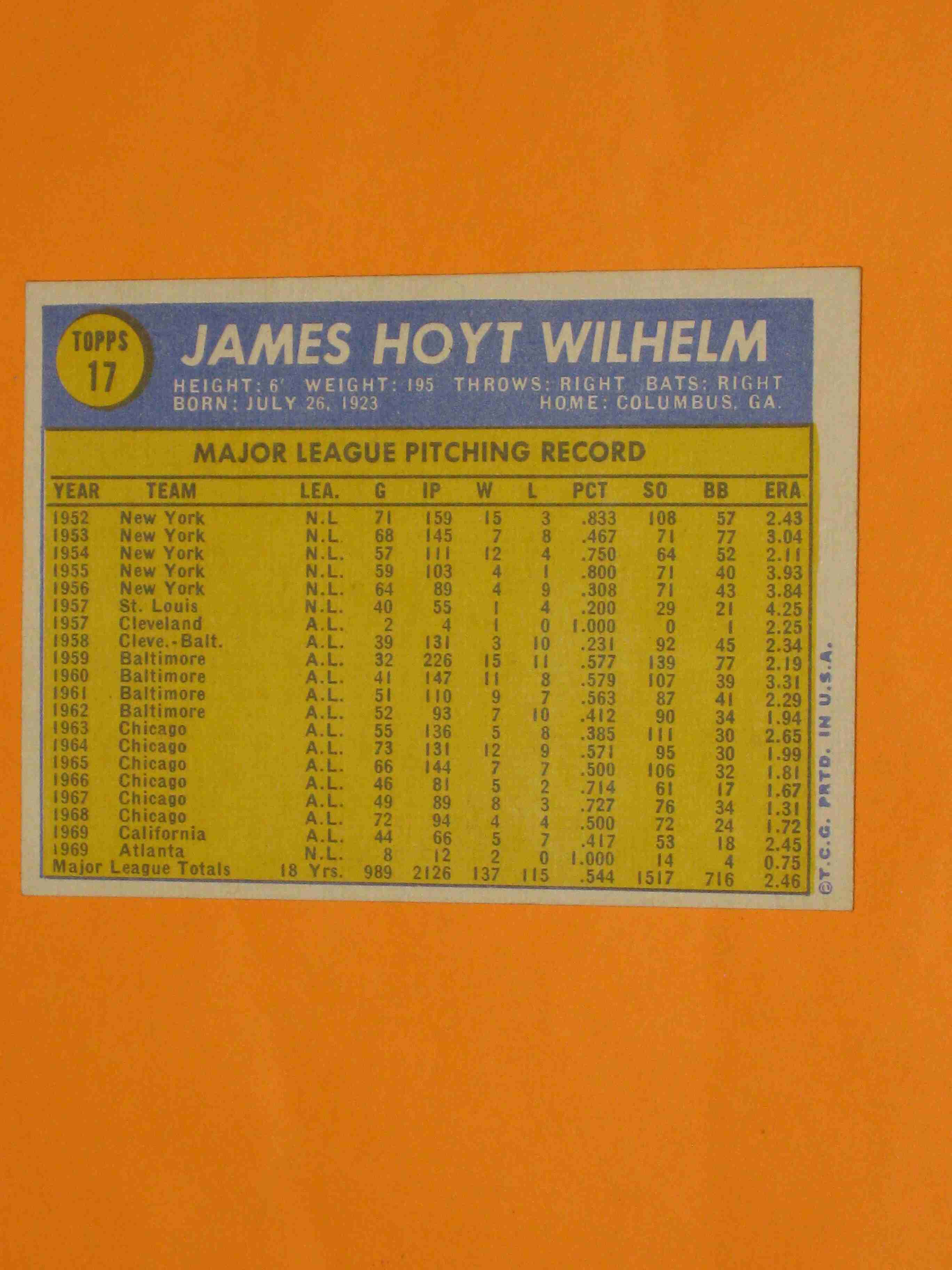 1970 Topps Hoyt Wilhelm #17 Atlanta Braves NICE