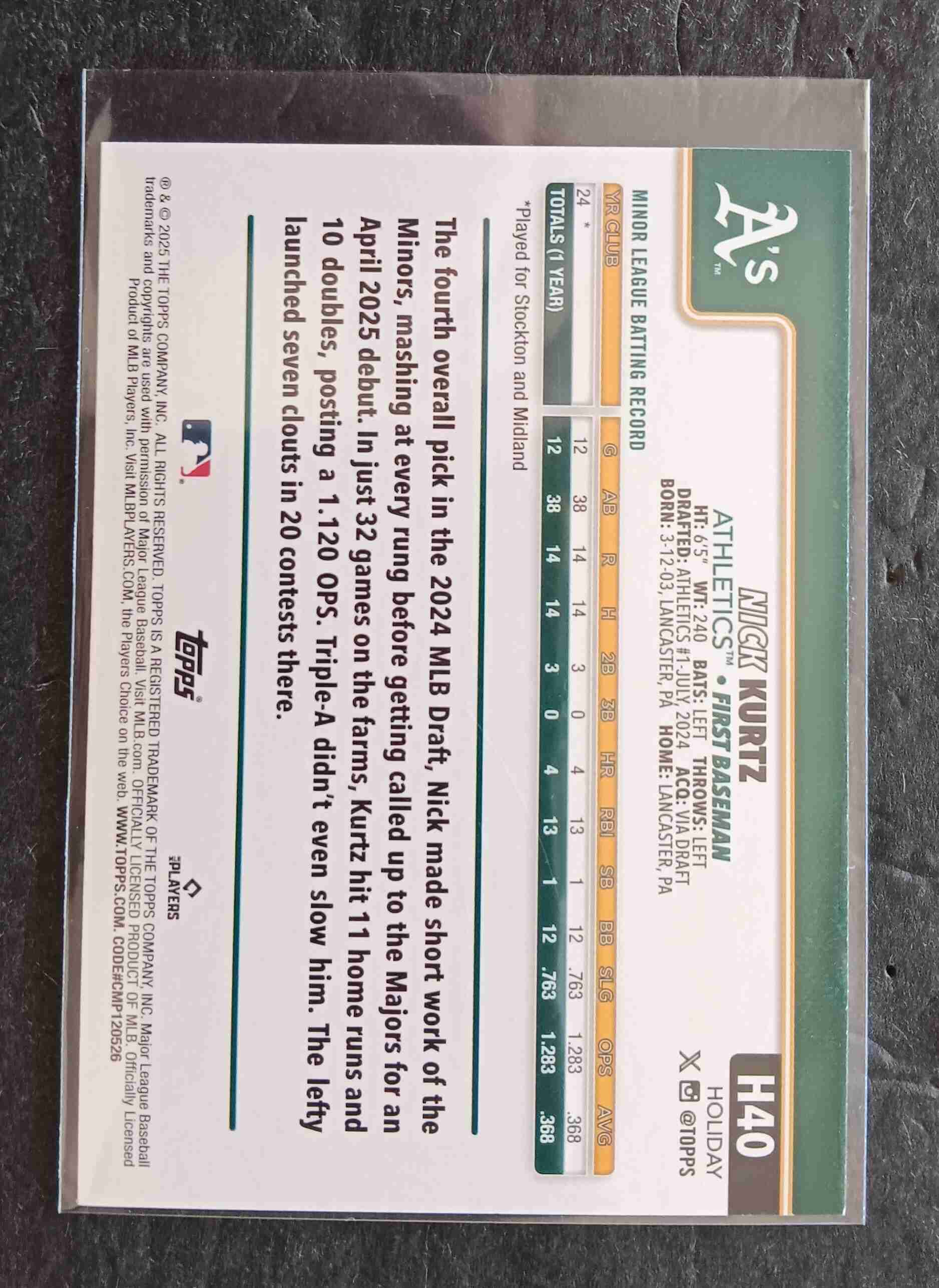 This auction is for a 2025 Topps Holiday Nick Kurtz RC.Card is number #H40,and is in NM condition.Thanks for looking.
