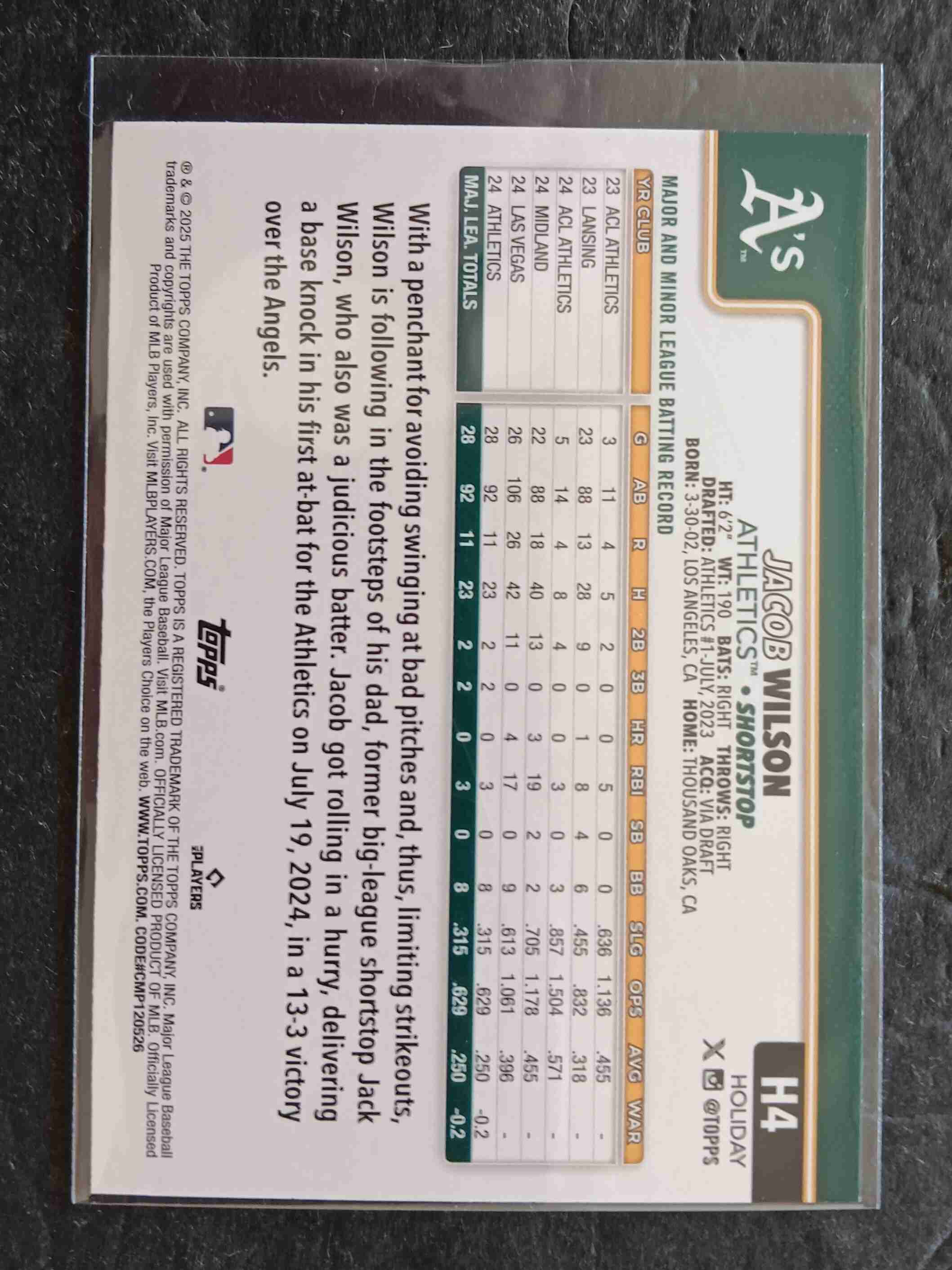 This auction is for a 2025 Topps Holiday Jacob Wilson RC.Card is number #H4,and is in NM condition.Thanks for looking.