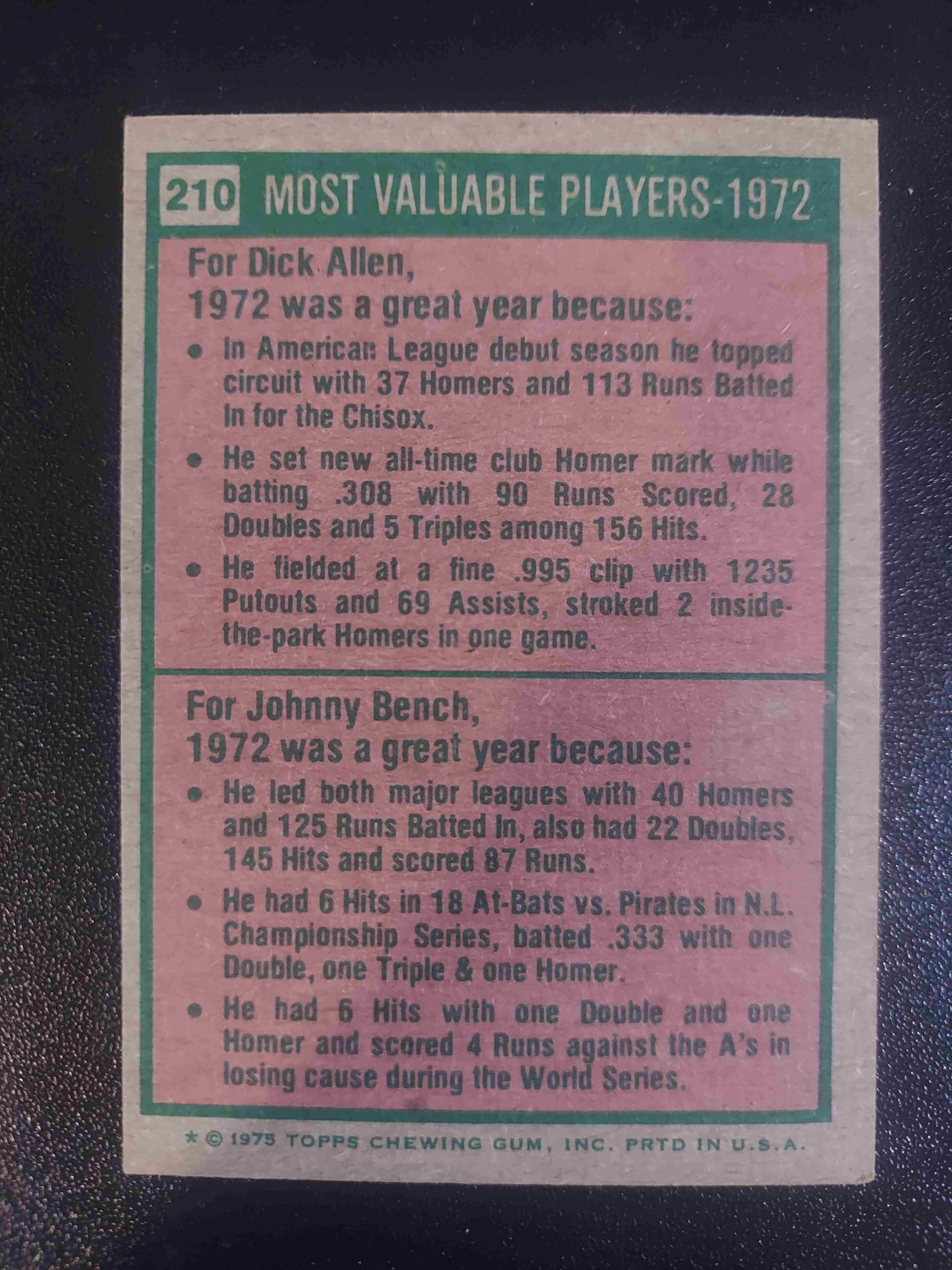 1975 TOPPS #210 1972 MVP'S RICH ALLEN/ JOHNNY BENCH
