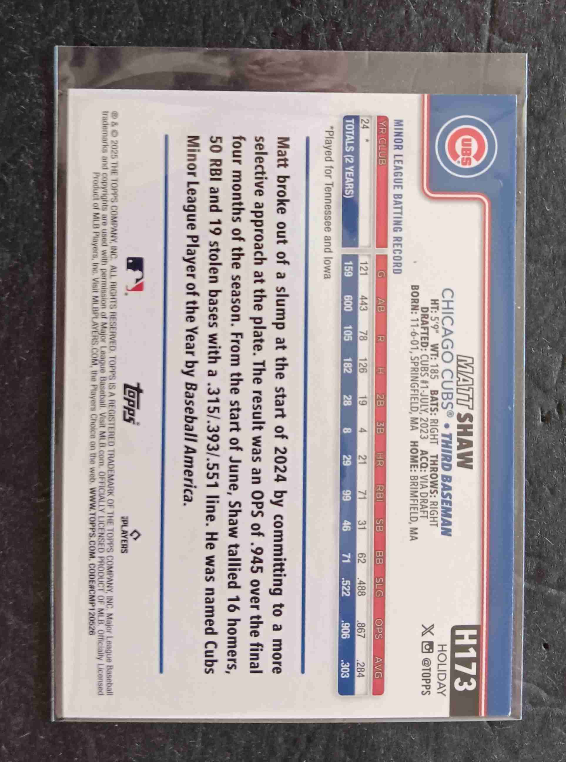 2025 Topps Holiday #H173 Matt Shaw RC Grey Glitter Parallel