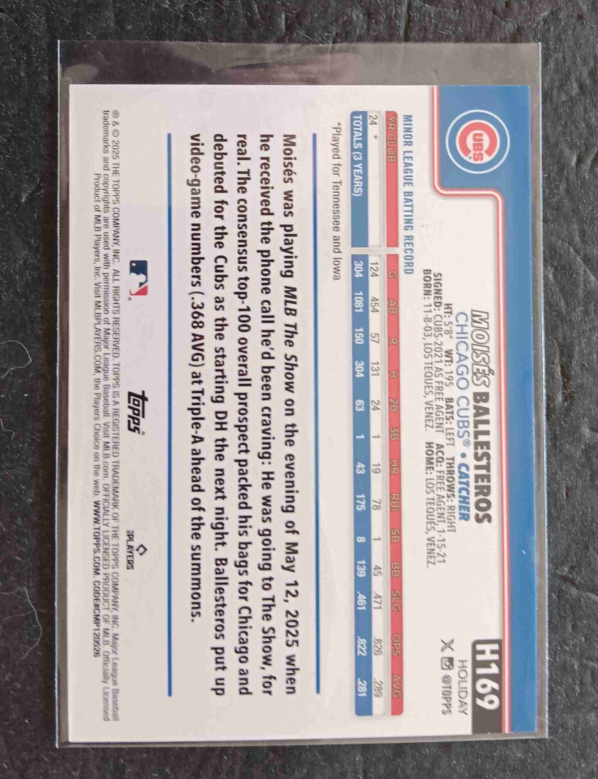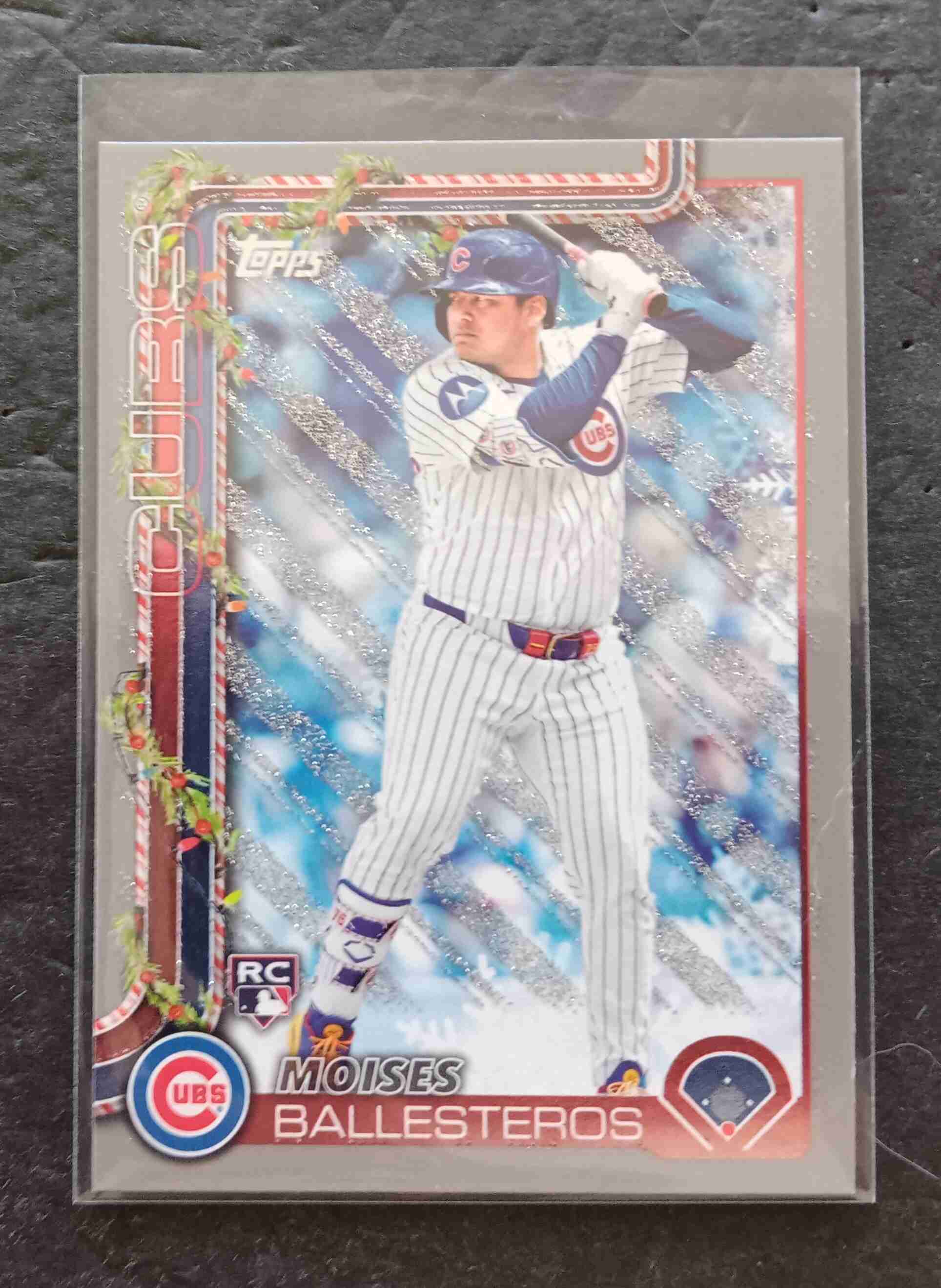 This auction is for a 2025 Topps Holiday Moises Ballesteros Gray Glitter Parallel Rookie.Card is number #H169,and is in NM condition.Thanks for looking.