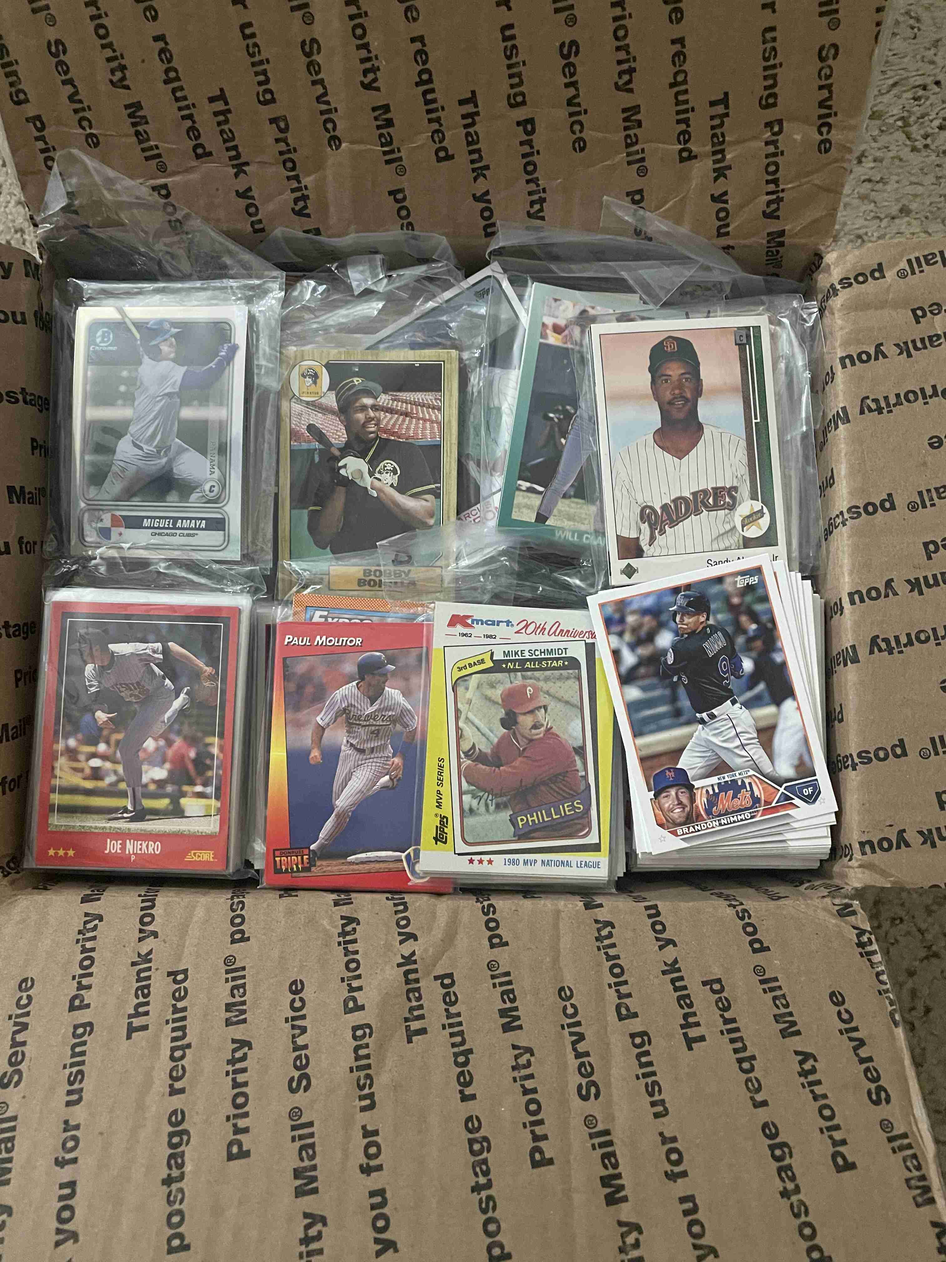 Medium Flat Rate box Full of Baseball Cards. There could be a few basketball or football in there as well. Various years. Has Commons, Small Stars for the majority of the box. Happy Bidding, great lot to go thru!