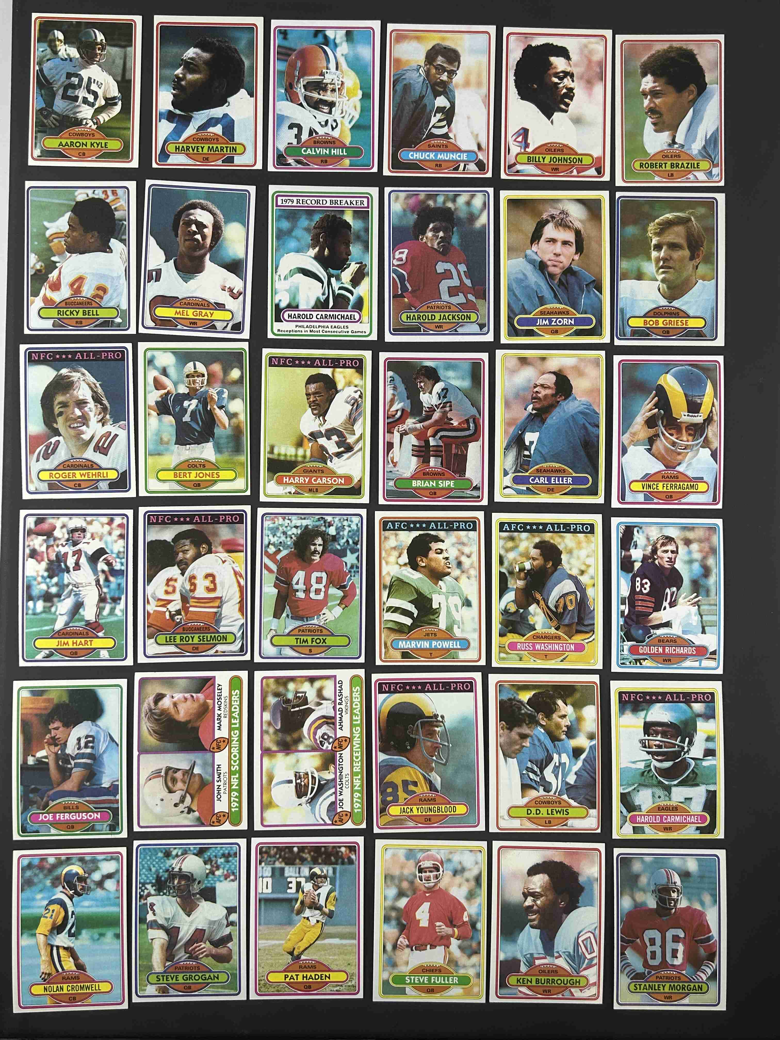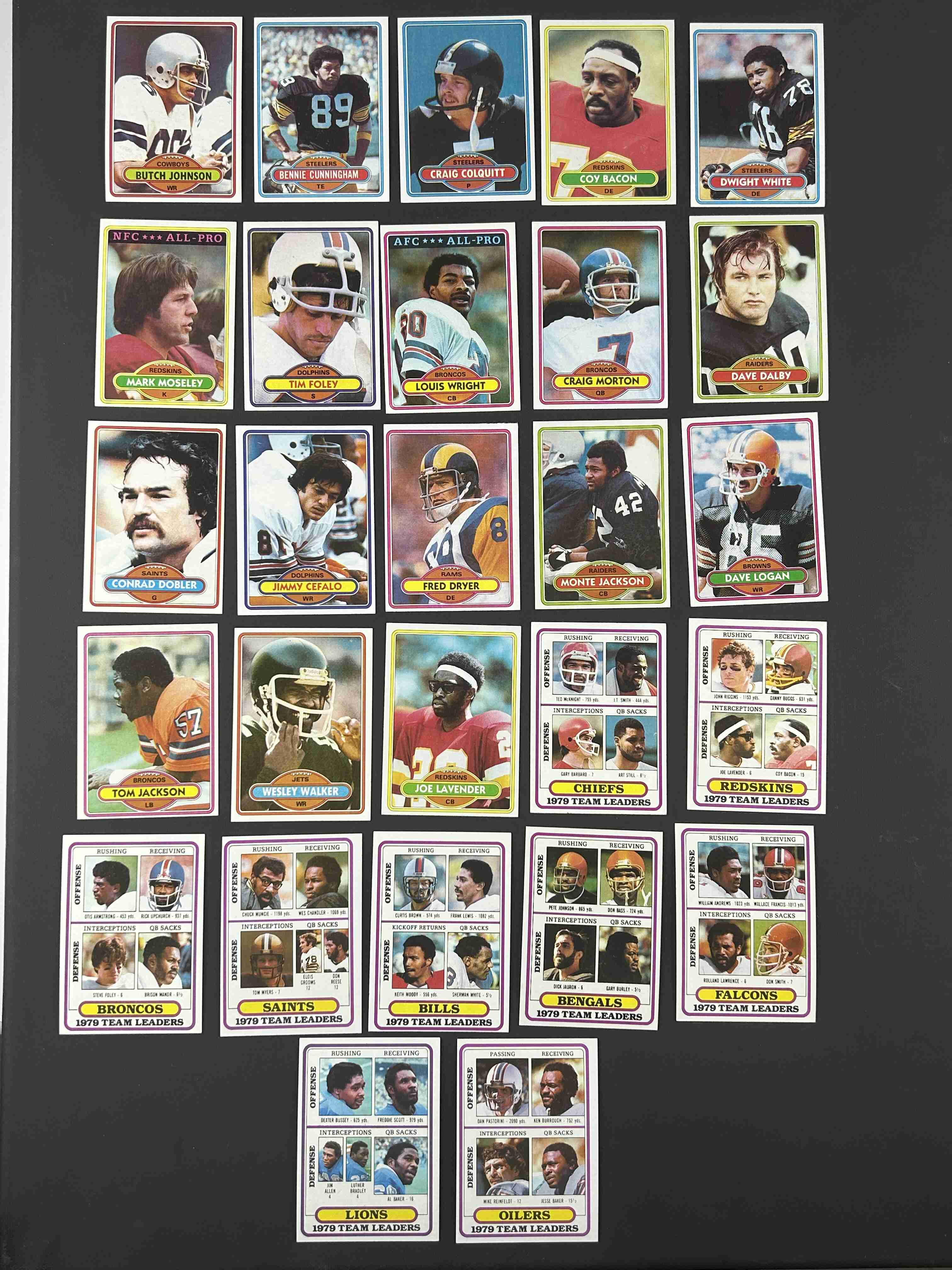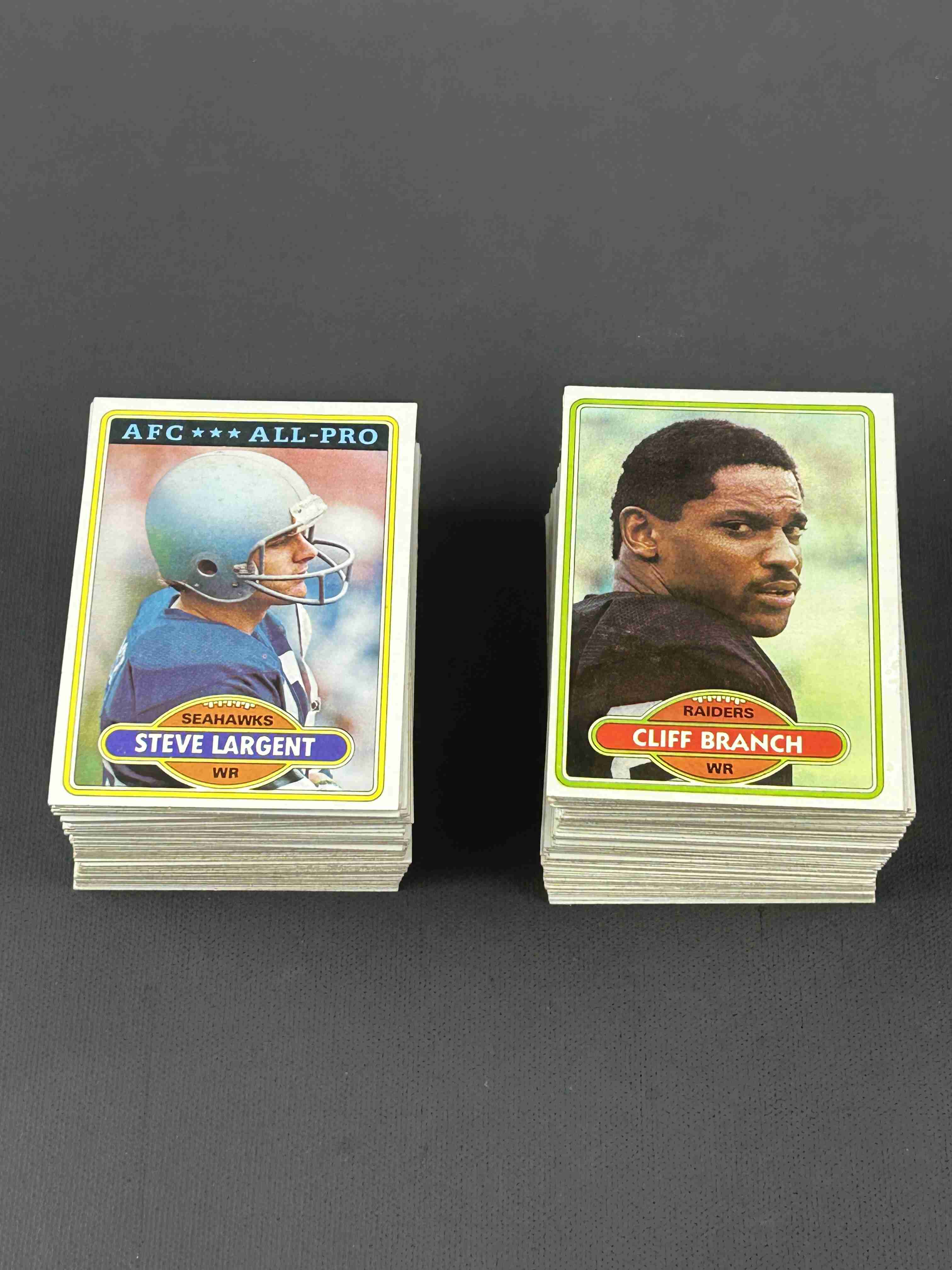 200 different 1980 Topps football cards. Condition ranges from EX to NM-MT with most in the range of EX to NM. Includes some stars & HOFers as well as Team Leaders cards and League Leaders cards.