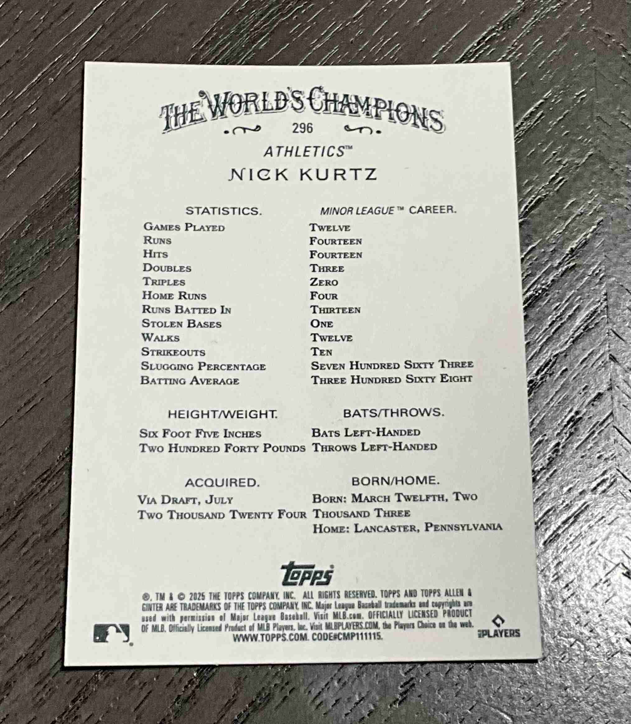 Nick Kurtz Rookie 2025 Allen & Ginter Athletics Rc