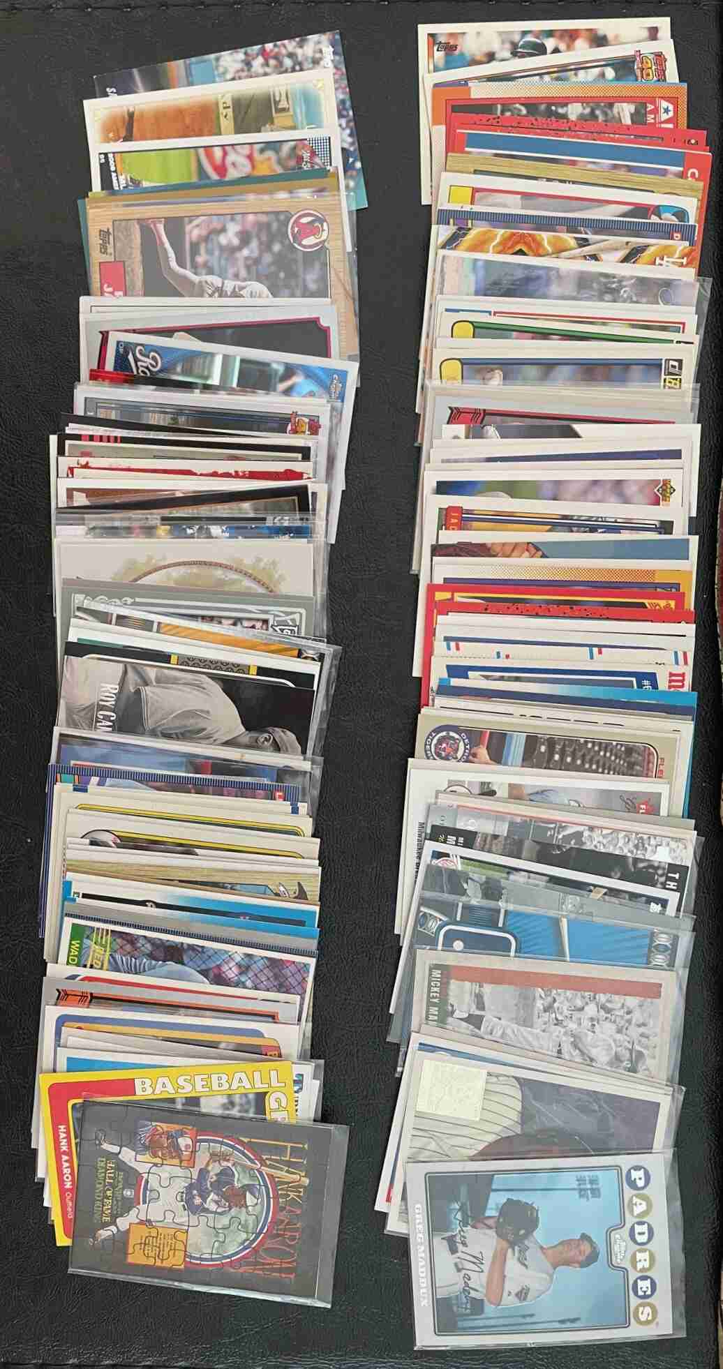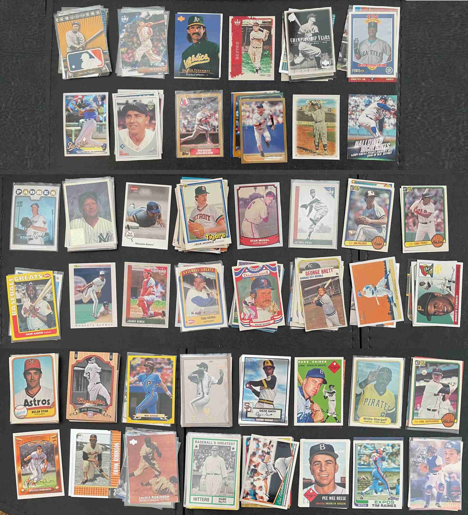 300 Count Box filled with cards of Hall of Famers. A few duplicates. Includes Hank Aaron, Roberto Alomar, Johnny Bench, Yogi Berra, Wade Boggs, George Brett, Roy Campanella, Roberto Clemente, Ty Cobb, Joe Dimaggio, Dennis Eckersley, Jimmie Foxx, Lou Gehrig, Ken Griffey Jr, Vladimir Guerrero, Gil Hodges, Reggie Jackson, Derek Jeter, Walter Johnson, Sandy Koufax, Greg Maddux, Mickey Mantle, Paul Molitor, Jack Morris, Stan Musial, Satchel Paige, Jim Palmer, Tony Perez, Brooks Robinson, Frank Robinson, Jackie Robinson, Babe Ruth, Cal Ripken Jr, Pee Wee Reese, Tim Raines, Mike Piazza, Nolan Ryan, Ryne Sandberg, Mike Schmidt, Tome Seaver, Ozzie Smith, Duke Snider, Willie Stargell, Carl Yastrzemski. Fun lot of cards.