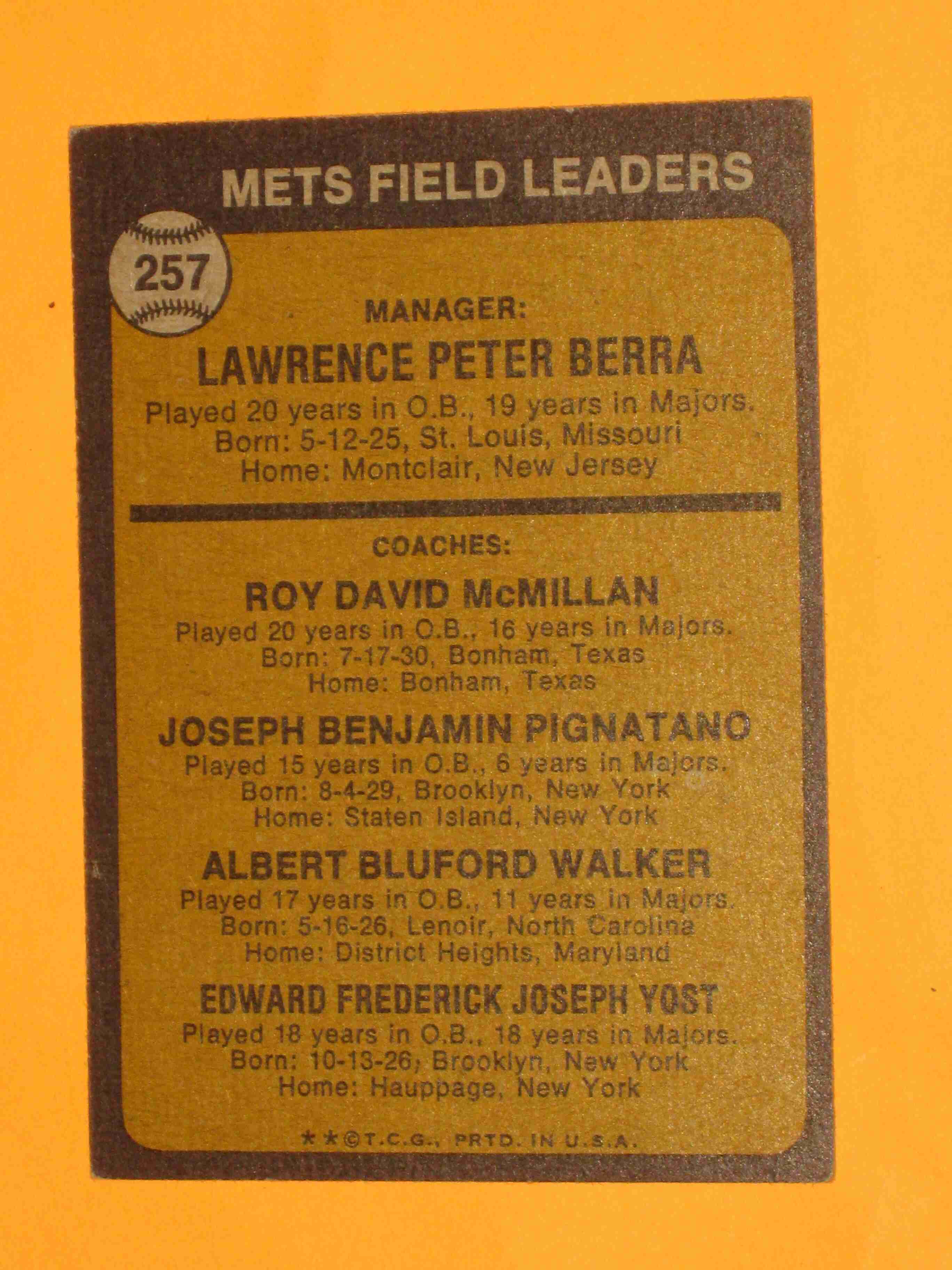 1973 Topps Yogi Berra #257 New York Mets