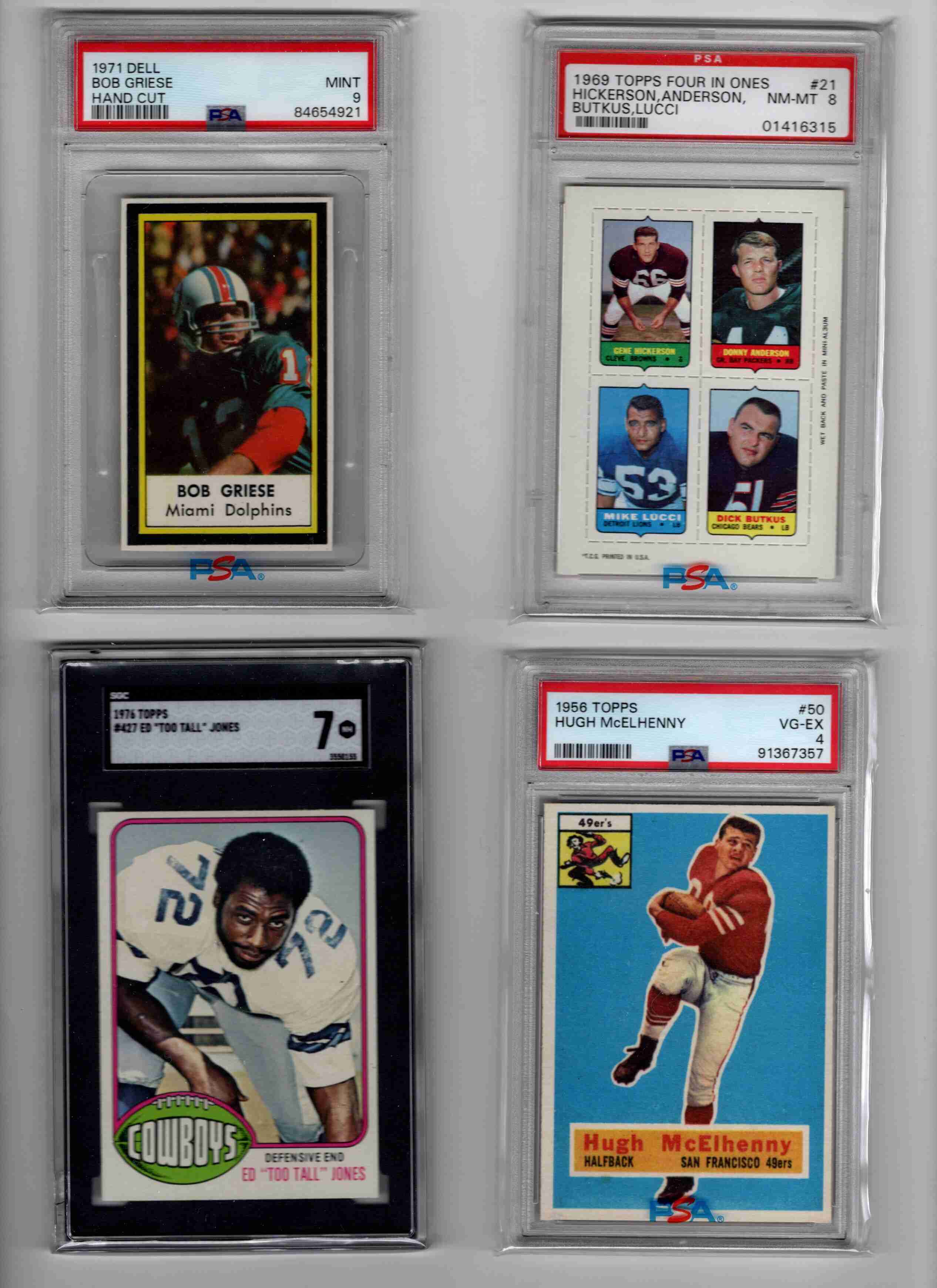 This lot contains 9 graded vintage football cards with several Hall of Famers. You get every card pictured: 1971 Dell Bob Griese (HOF) PSA 9; Dick Butkus (HOF)/Gene Hickerson (HOF)/Donny Anderson/Mike Lucci 1969 Topps Four In Ones PSA 8; Ed "Too Tall" Jones 1976 Topps RC SGC 7; Hugh McElhenny (HOF) 1956 Topps PSA 4; Joe Geri 1950 Bowman PSA 6; Johnny Unitas (HOF) 1970 Topps Glossy PSA 7; Lou Groza (HOF) 1954 Bowman PSA 6; William "Flash" Swiacki 1948 Leaf PSA 3; and Ron Hall 1965 Topps SGC 7.5
