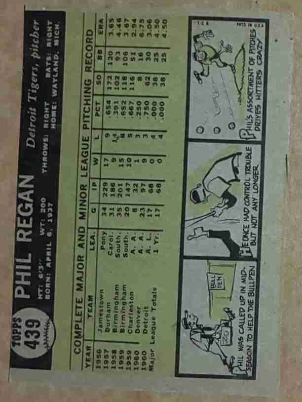 1961 Topps #439 Phil Regan. Card is EX+ but off-center (see scan).