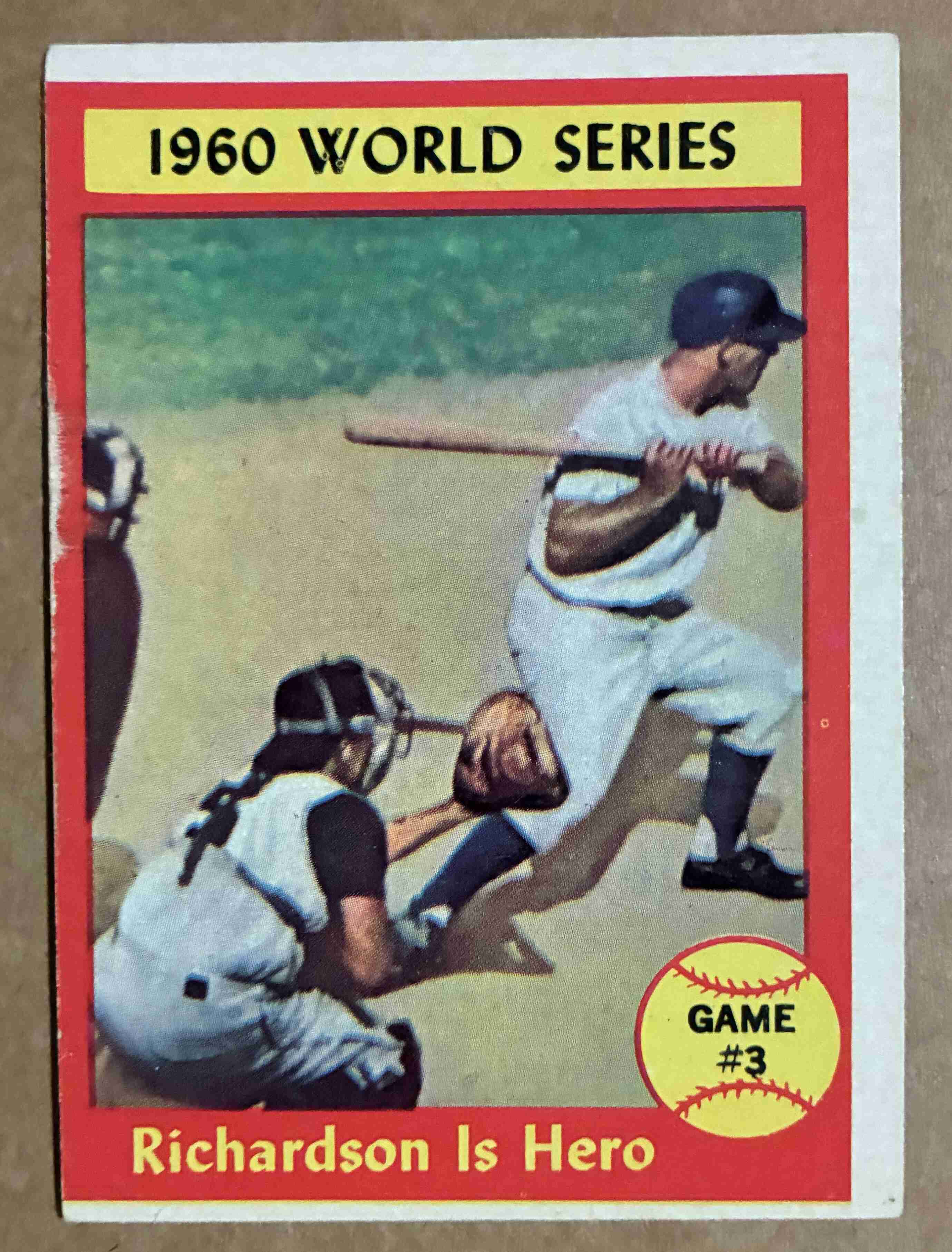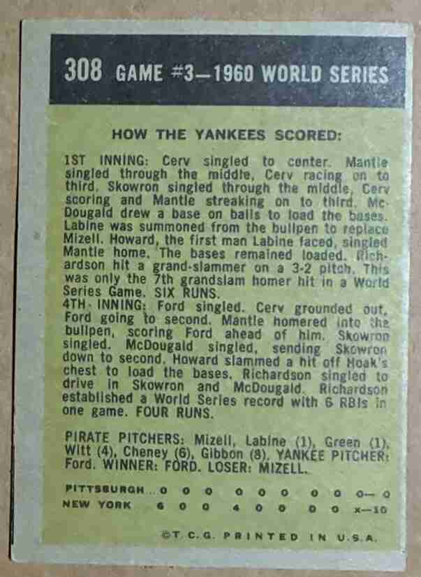 1961 Topps #308 - Word Series Game 3 "Richardson is Hero". Card is EX but O/C - see scan.