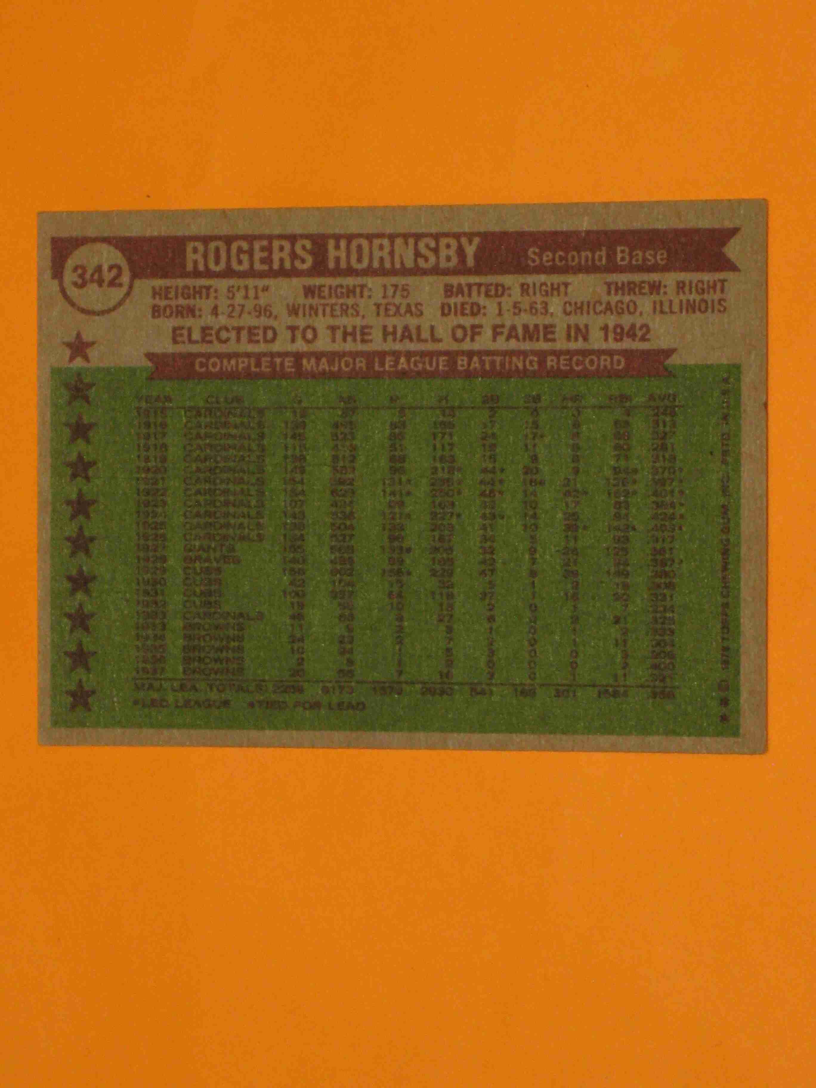 1976 Topps Rogers Hornsby #342 All Time All Star