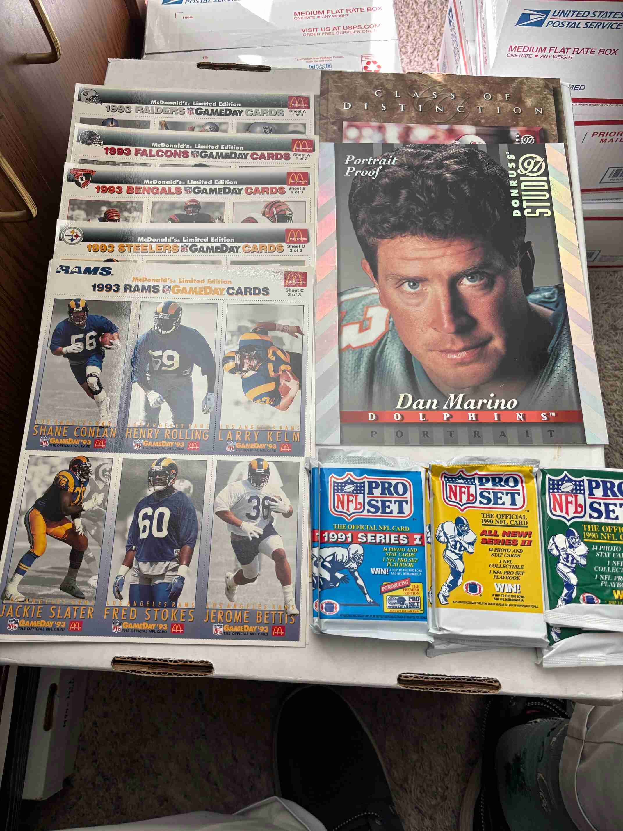 Huge clearance collection of 2500 Football cards including a rare portrait cards of Dan Marin0, Uncut sheets, high value vintage, rookies, stars, autographs, and unopened packs, all in great condition. You will receive everything shown in the photos and more. I am having a complete clearance of my 2,000,000 card collection, so please check out my other auctions for more great deals.