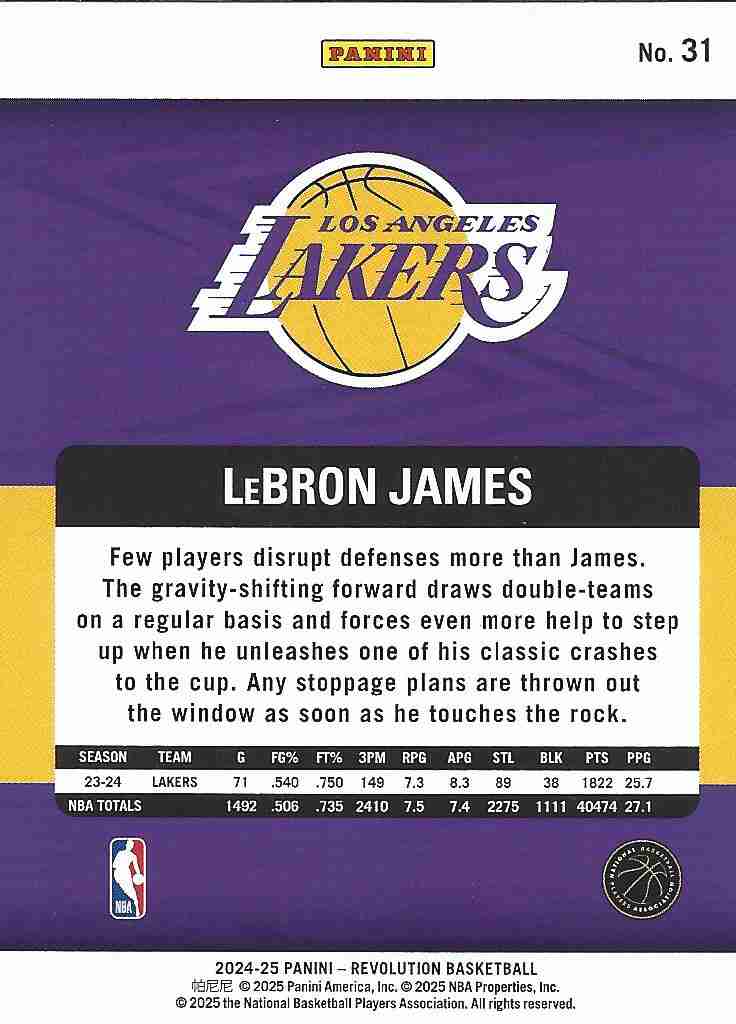 2024-25 Panini Revolution Card (#31) of the Los Angeles Lakers superstar Lebron James. The card is in NM conditon.