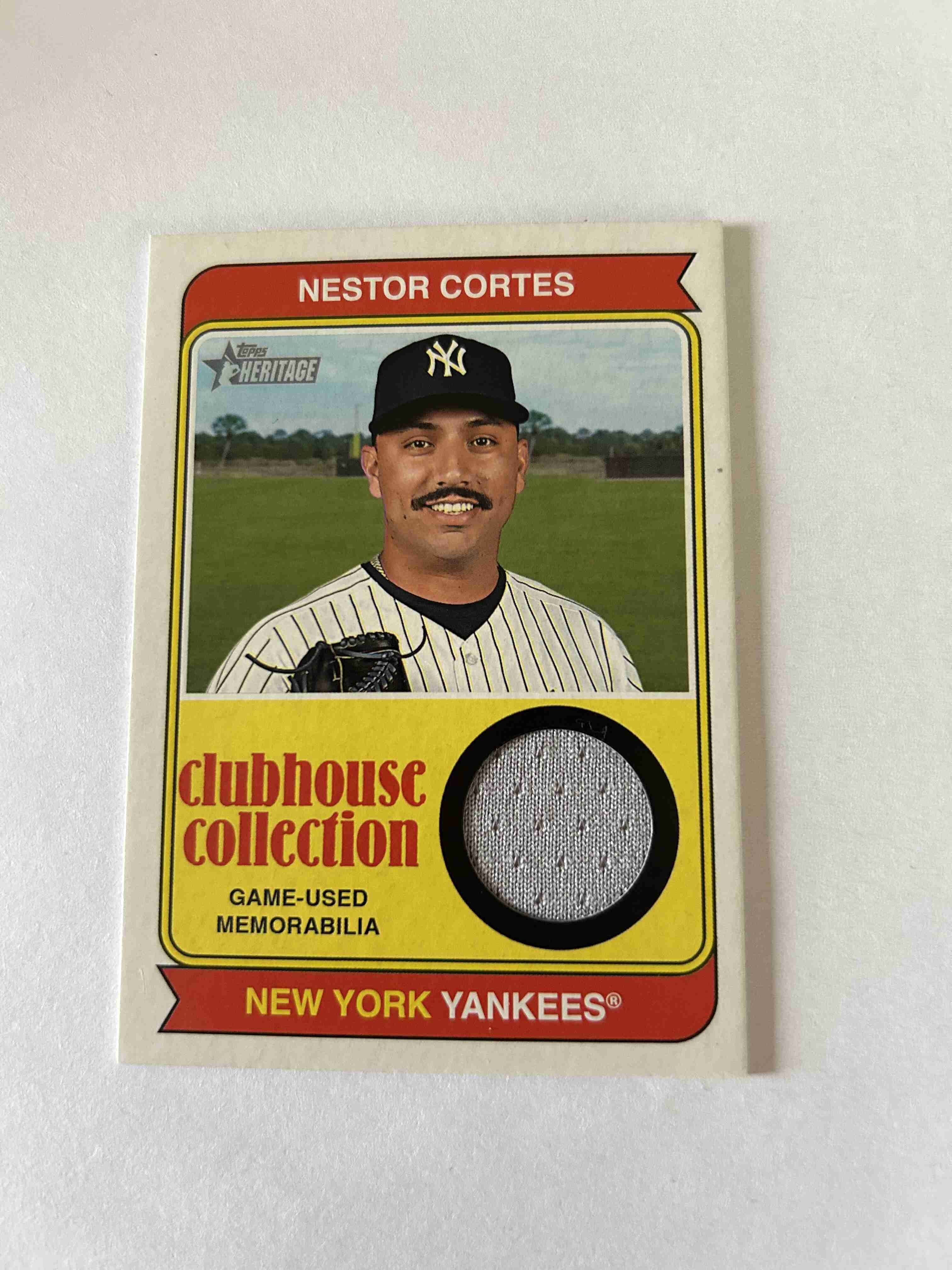 The item up for bid is a 2023 Topps Heritage Nestor Cortes CCR-NC Ckubhouse Collection Relic Card.