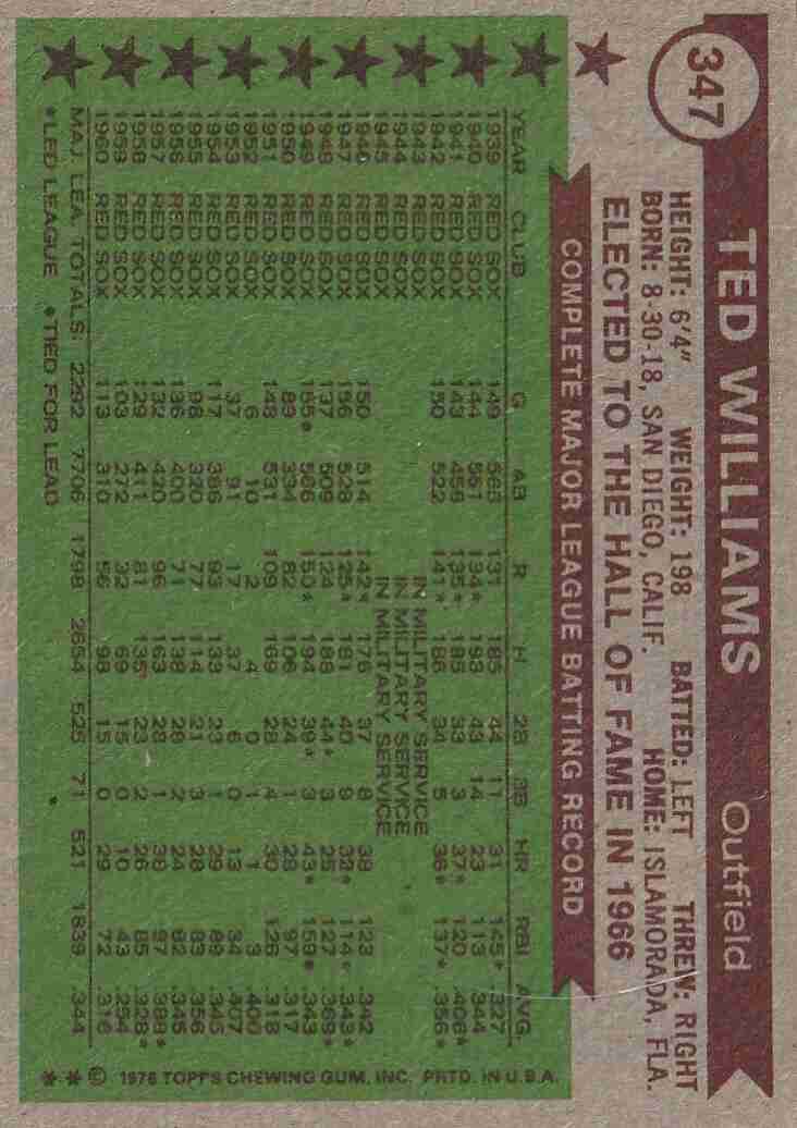 1976 Topps Sporting News All Time AS #347 Ted Williams