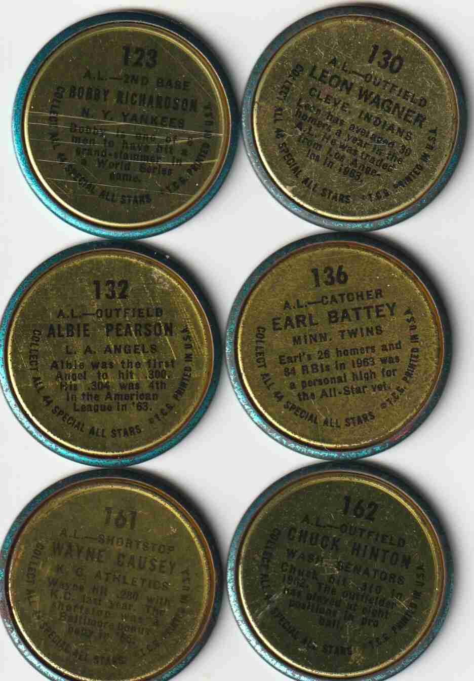 6-1964 Topps Coins All Stars #'s 123 130 132 136 161 162
