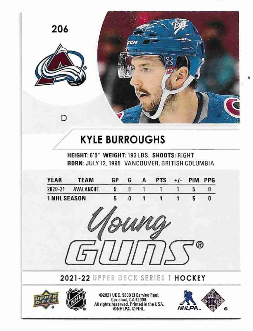 2021-22 UPPER DECK YOUNG GUNS #206 KYLE BURROUGHS (RC)