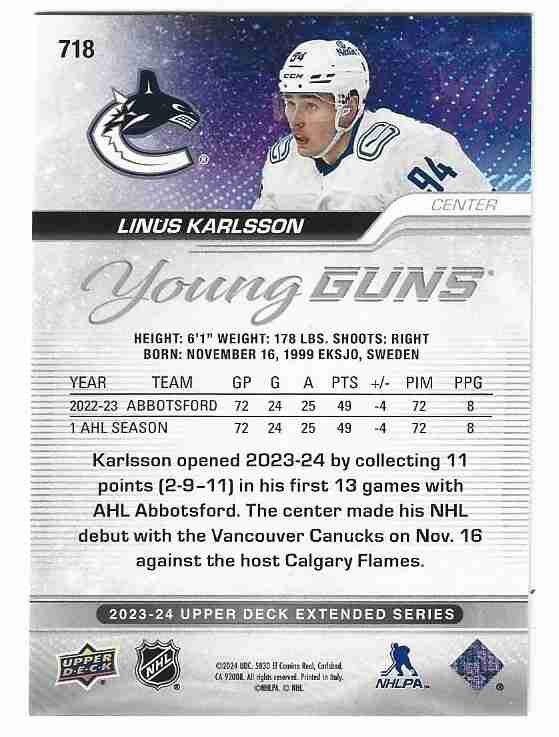 2023/24 EXTENDED #718 LINUS KARLSSON YOUNG GUNS