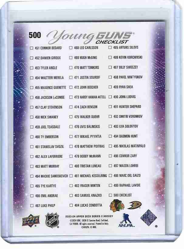 2023/24 UD 2 #500 YOUNG GUNS CHECKLIST BEDARD/CARLSSON