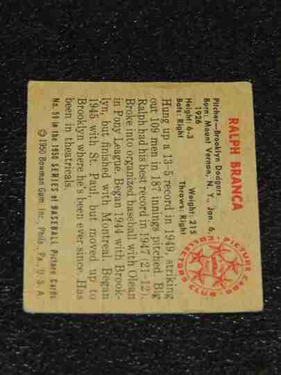 1950 Bowman #59 Ralph Branca - VG/VG+ - BV $80