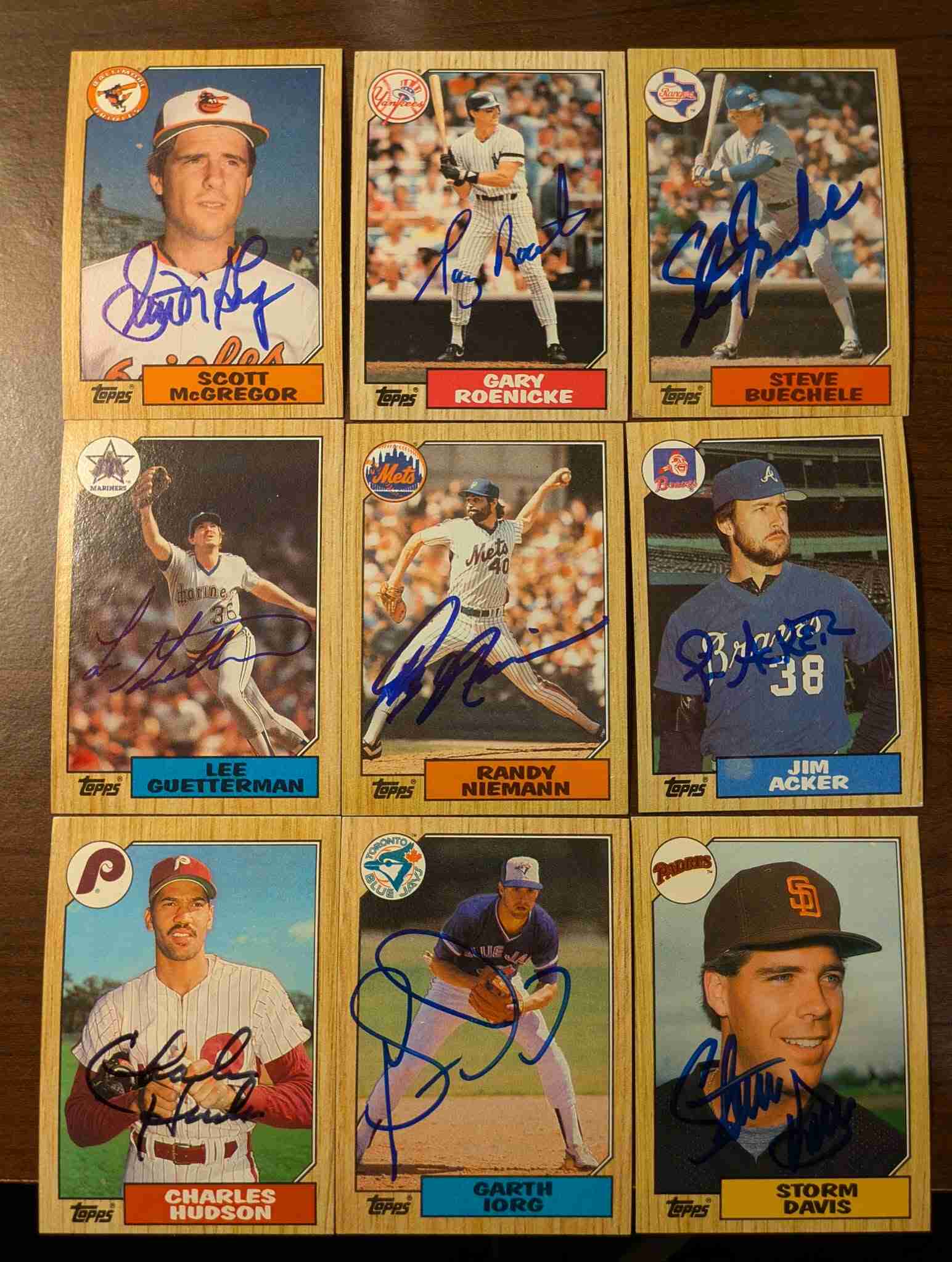 Nice 9 card signed lot of 1987 Topps cards. Includes some top names of the 80s. Autos are guaranteed to pass 3rd party authentication (Beckett, JSA, PSA, etc.). Players included are: Scott McGregor, Gary Roenicke, Steve Buechele, Lee Guetterman, Randy Niemann, Jim Acker, Charlie Hudson, Garth Iorg and Storm Davis