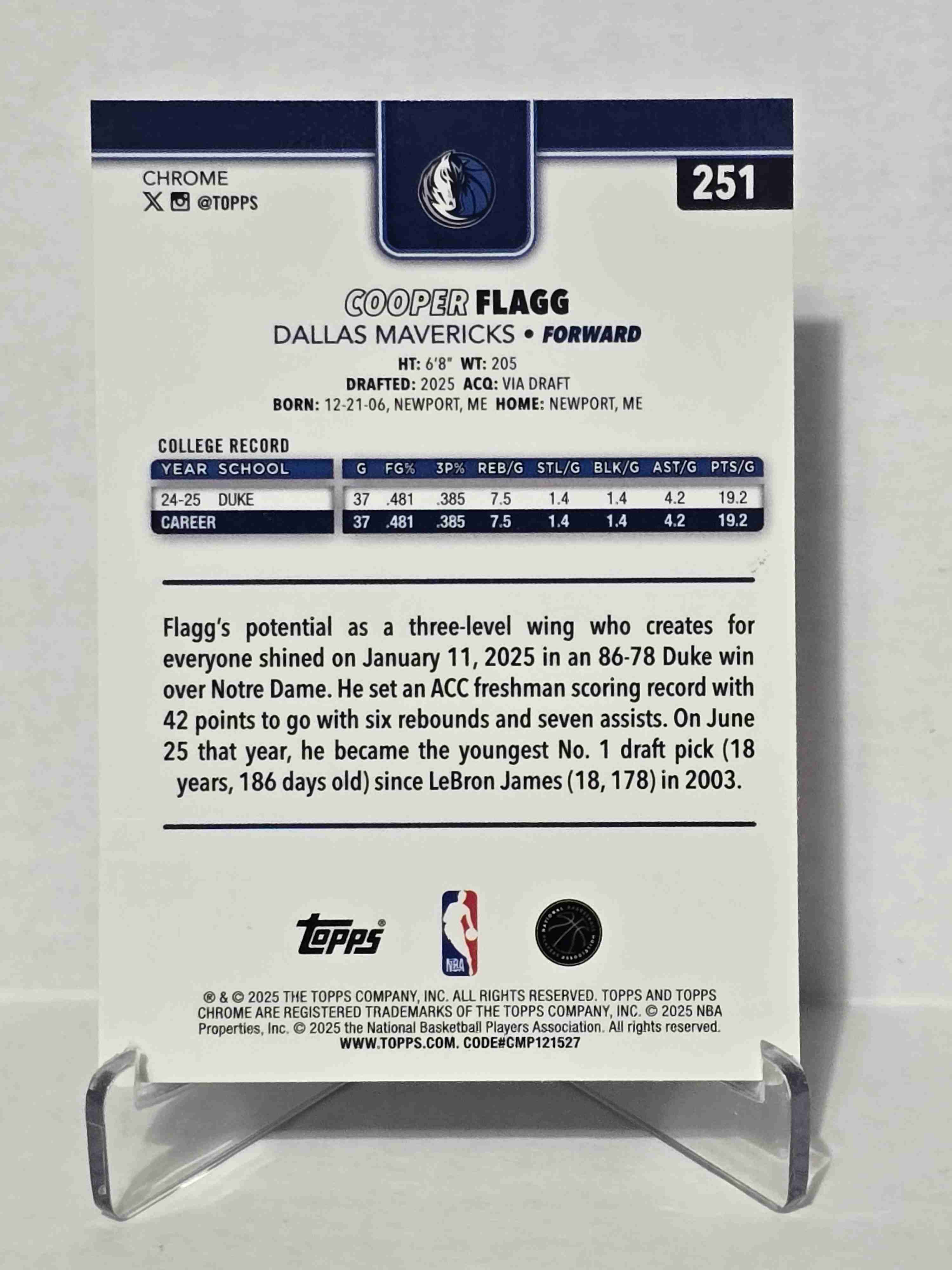 2025-26 Topps Chrome Cooper Flagg. Card is Off Centered but otherwise mint. All my auctions ship in a bubble mailer with tracking.