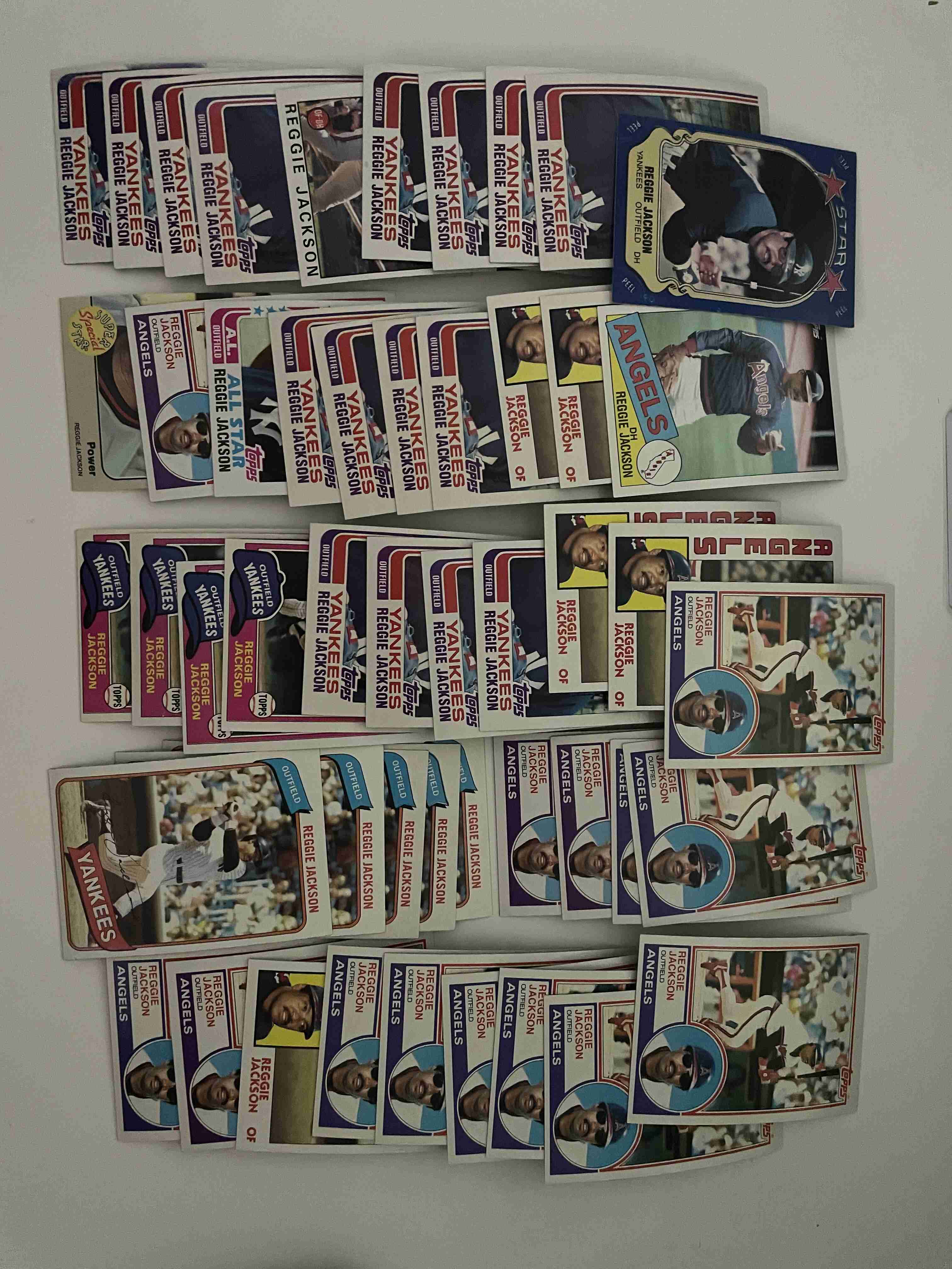 49 Reggie Jackson cards. Many duplications. See pic for exact cards. Great for a Reggie fan!