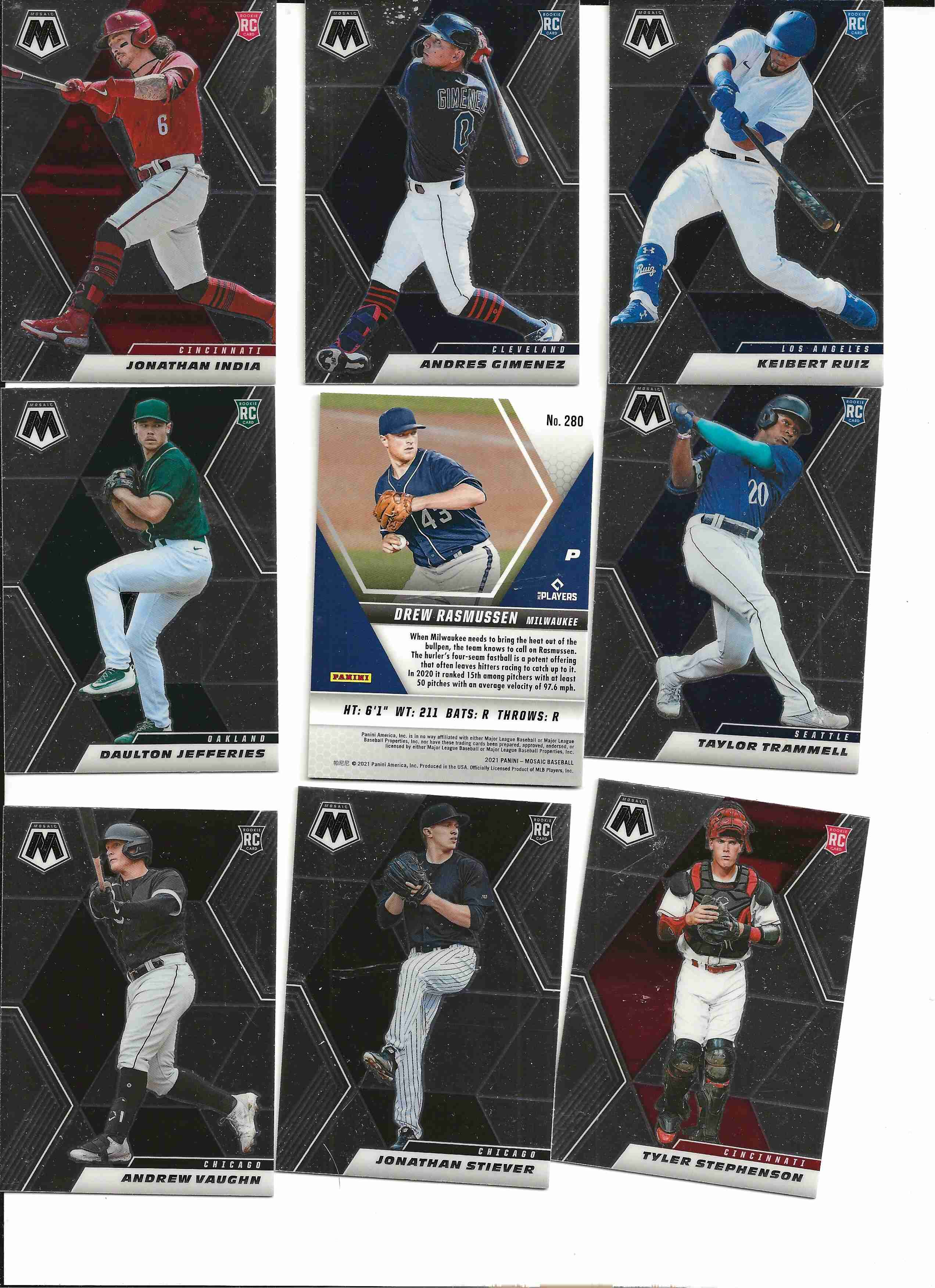 2021 Mosaic baseball Closeout item. All cards were from a collection I purchased. 46-base cards with some stars deGrom, Goldschmidt, Votto, Darvish, Sale, Lindor, Alonso, Machado, 102-Rookie cards. Not a complete set and contains duplicates. Will be shipped at two pounds with delivery confirmation
