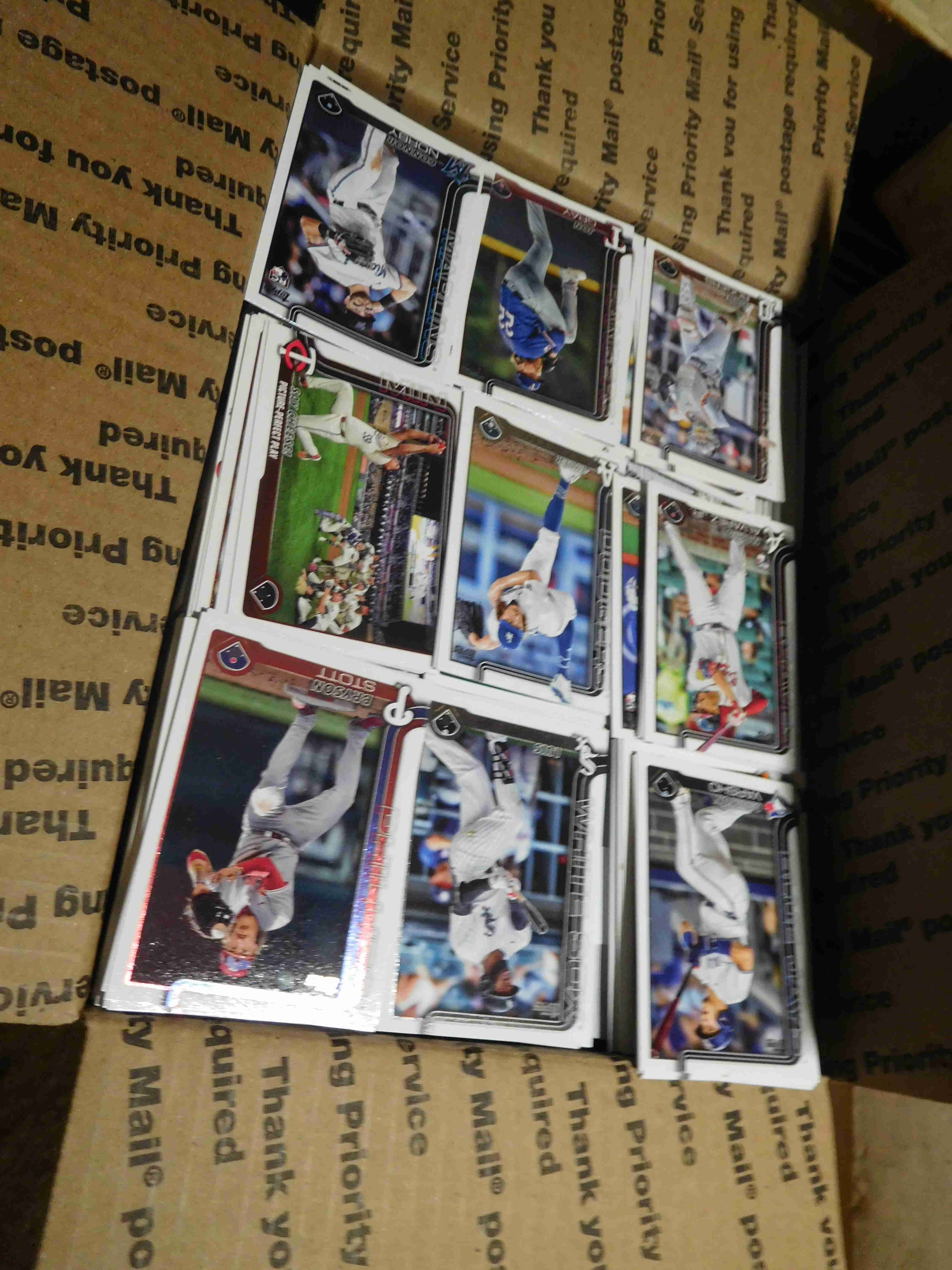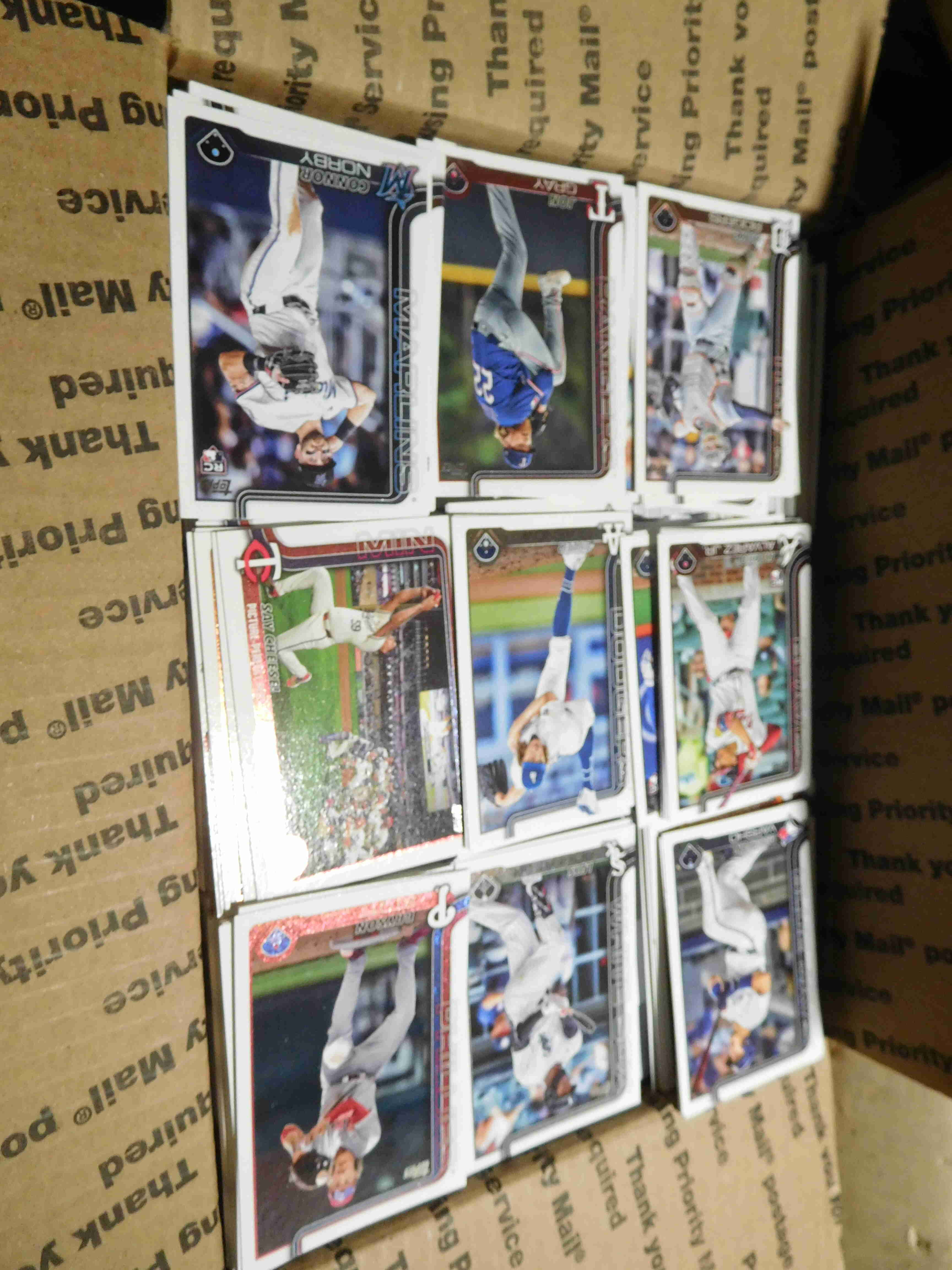 You are bidding on a Medium Flat Rate Box packed full of 2025 Topps Baseball Cards. Includes cards from series one, series two, and update. These are customer leftovers and some were partially collated to make sets. I have not double checked these for short prints or image variations although I doubt that any were left. Rookies and some stars included. Base cards only.