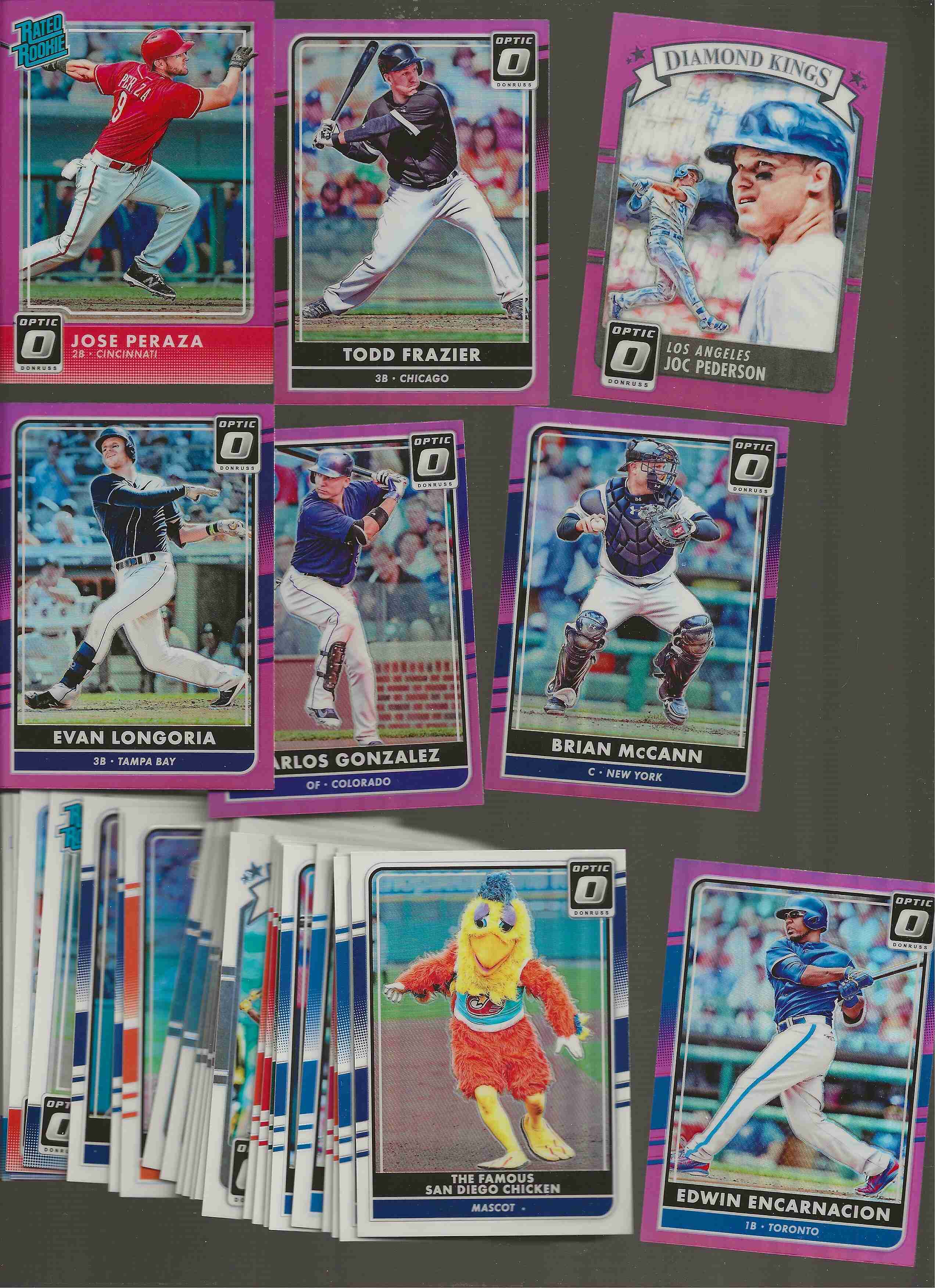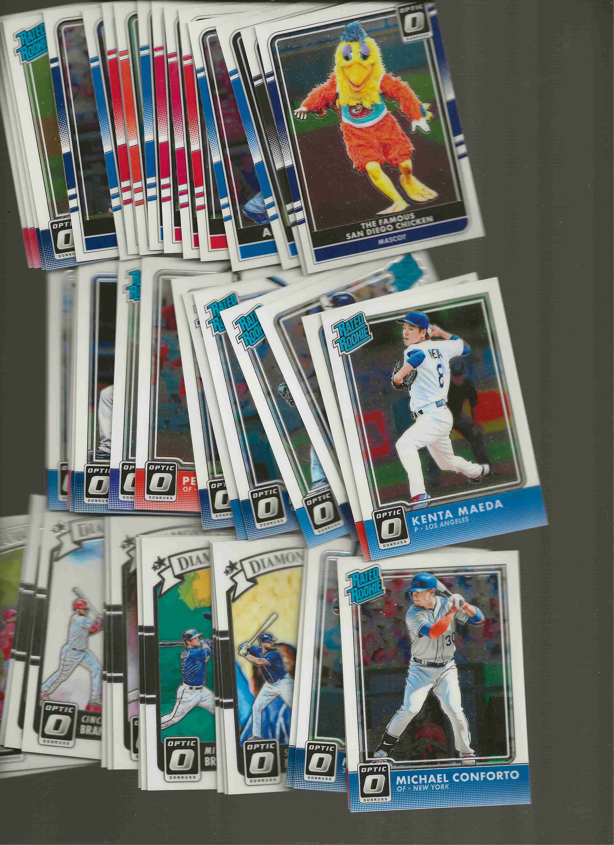 Shipped with USPS tracking, About 7 cents per card with multi win. 2016 Optic Close out. 34 refractors which 7 are purple (maybe pink). 51 base cards. Includes rated rookies, diamond kings