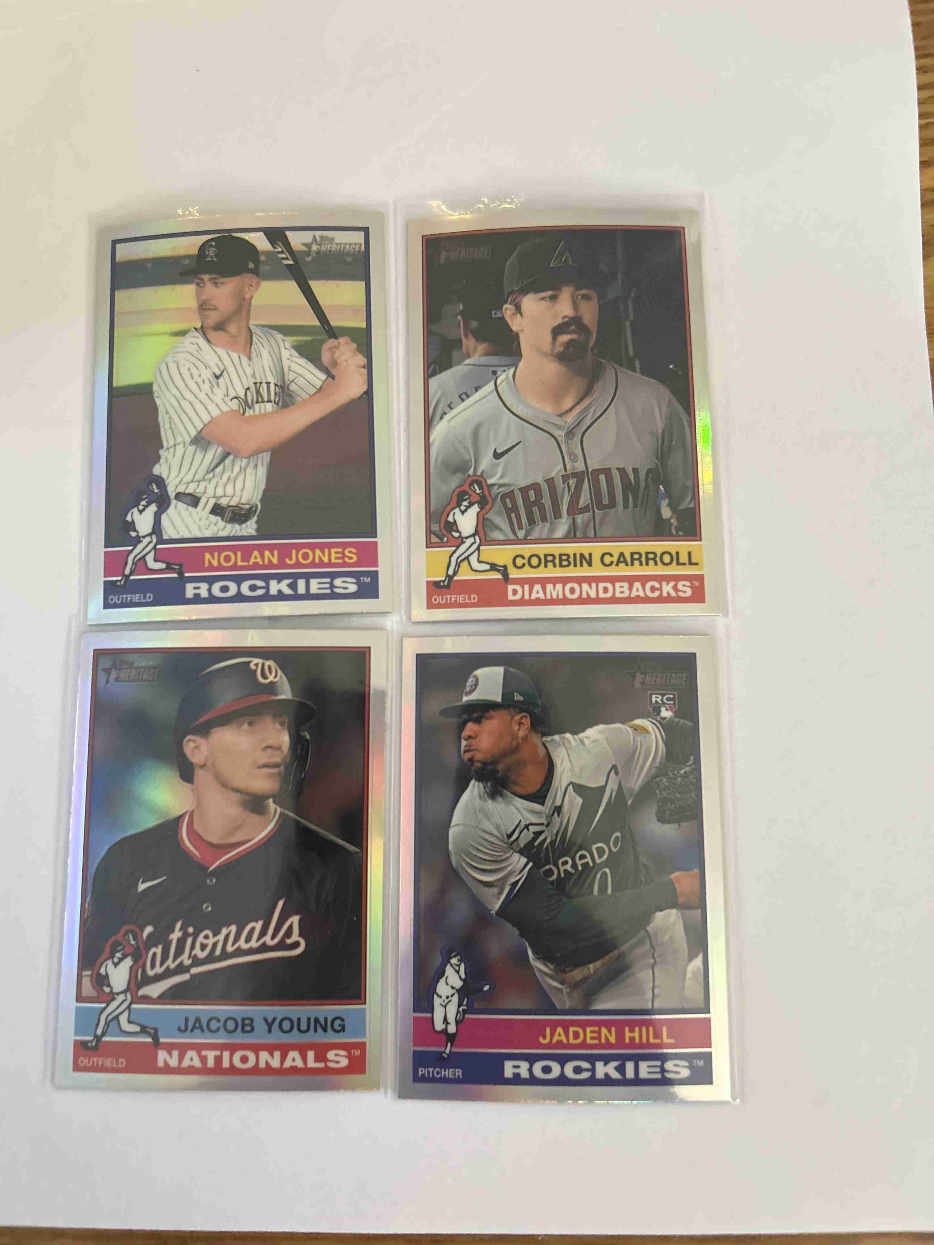 The cards up for bid are 2025 Topps Heritage refractors lot of 4. The cards featured are Nolan Jones (Rockies), Corbin Carroll (Diamondbacks), Jacob Young (Nationals) and Jaden Hill (Rockies).