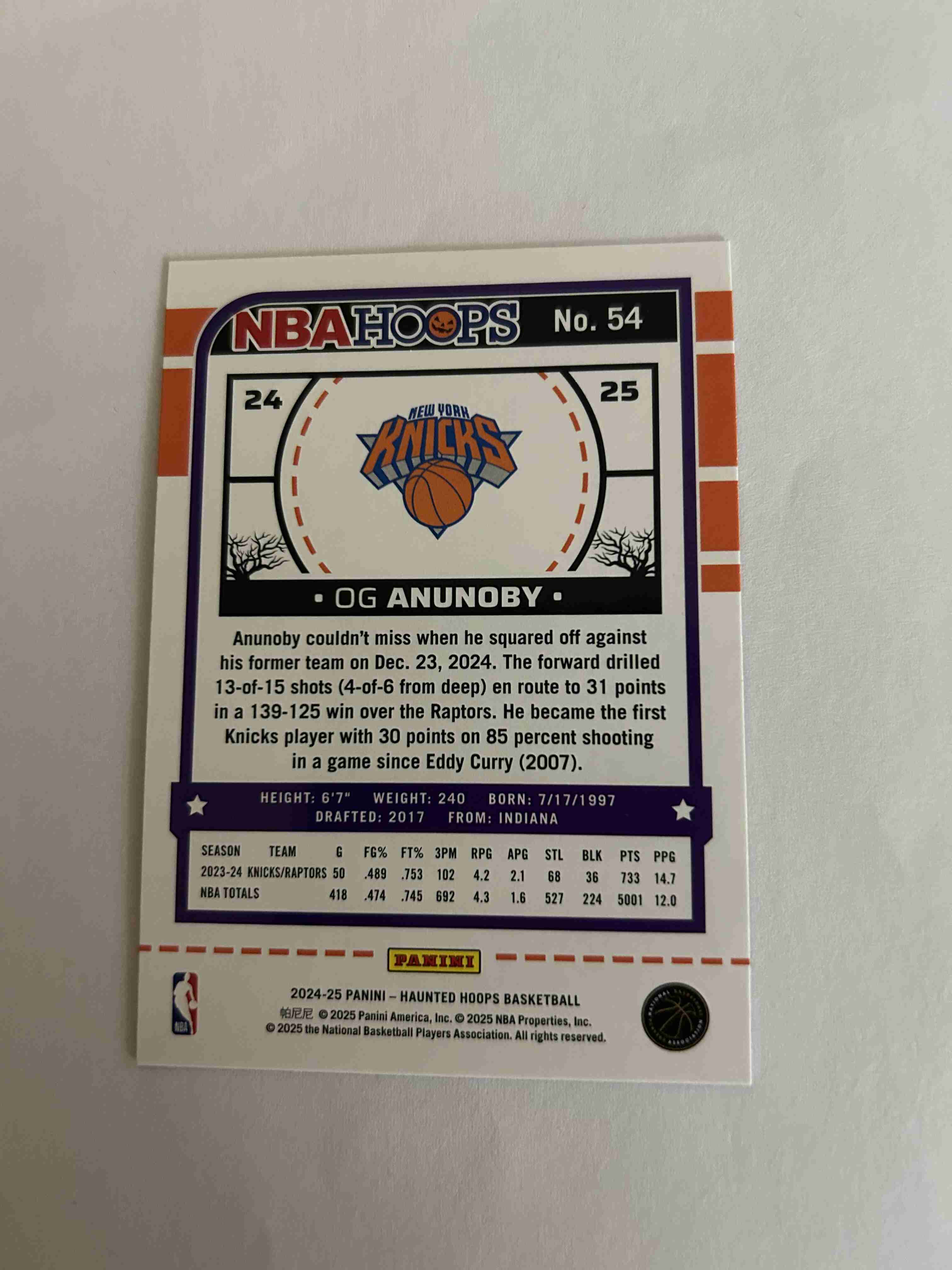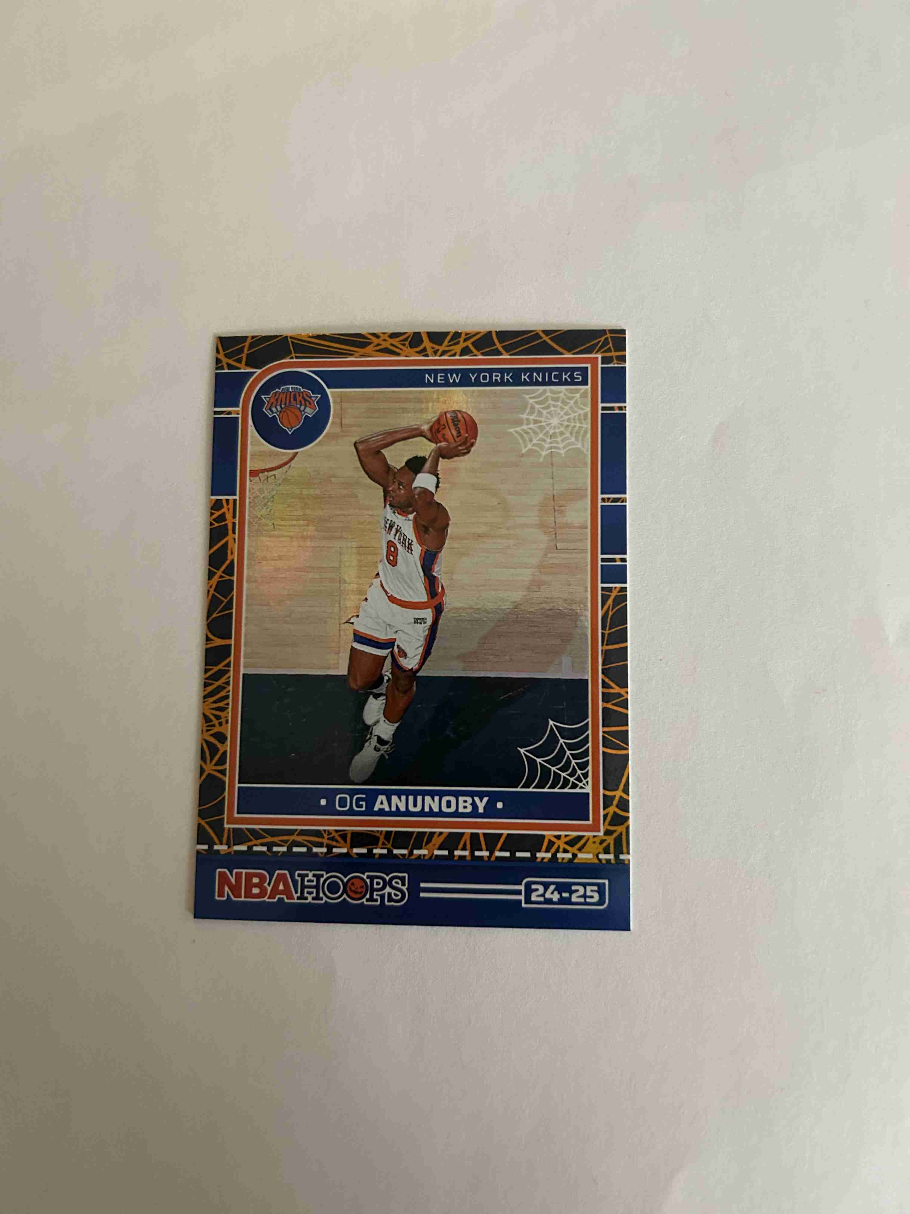 - The card up for bid and pictured above is a 2024-25 Haunted Hoops OG Anunoby holo webs #54 short print.