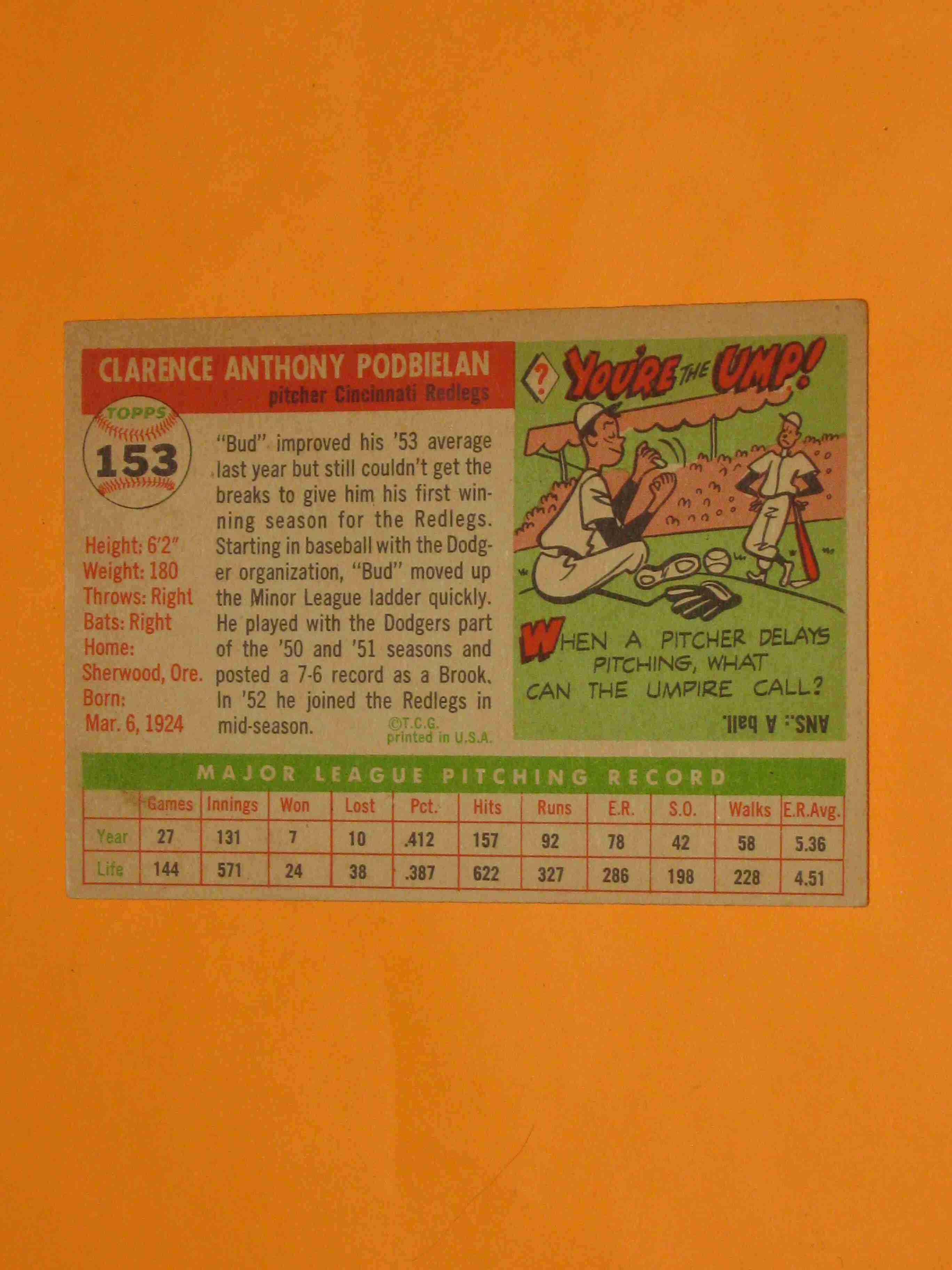 1955 Topps Bud Podbielan #153 Cincinnati Reds
