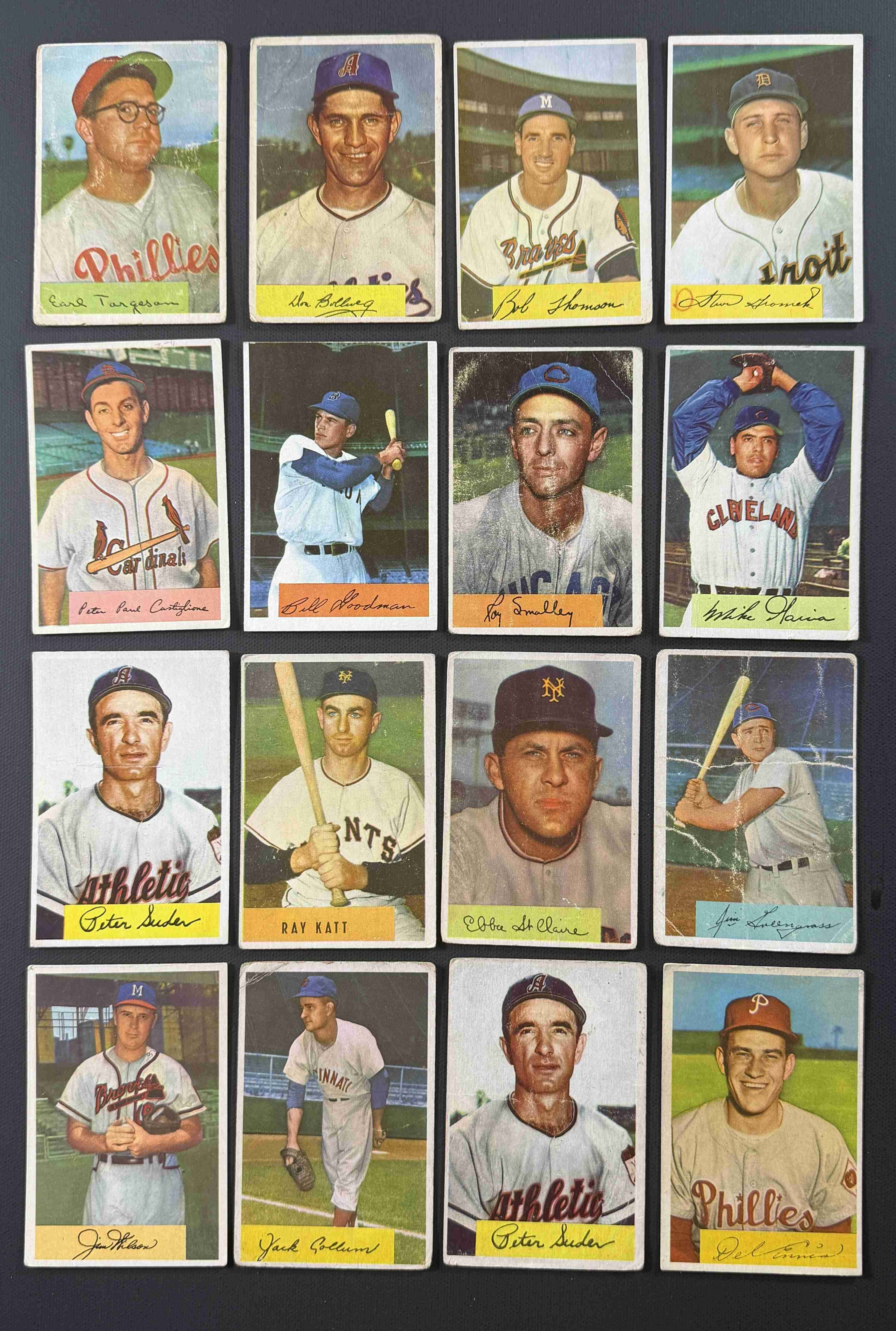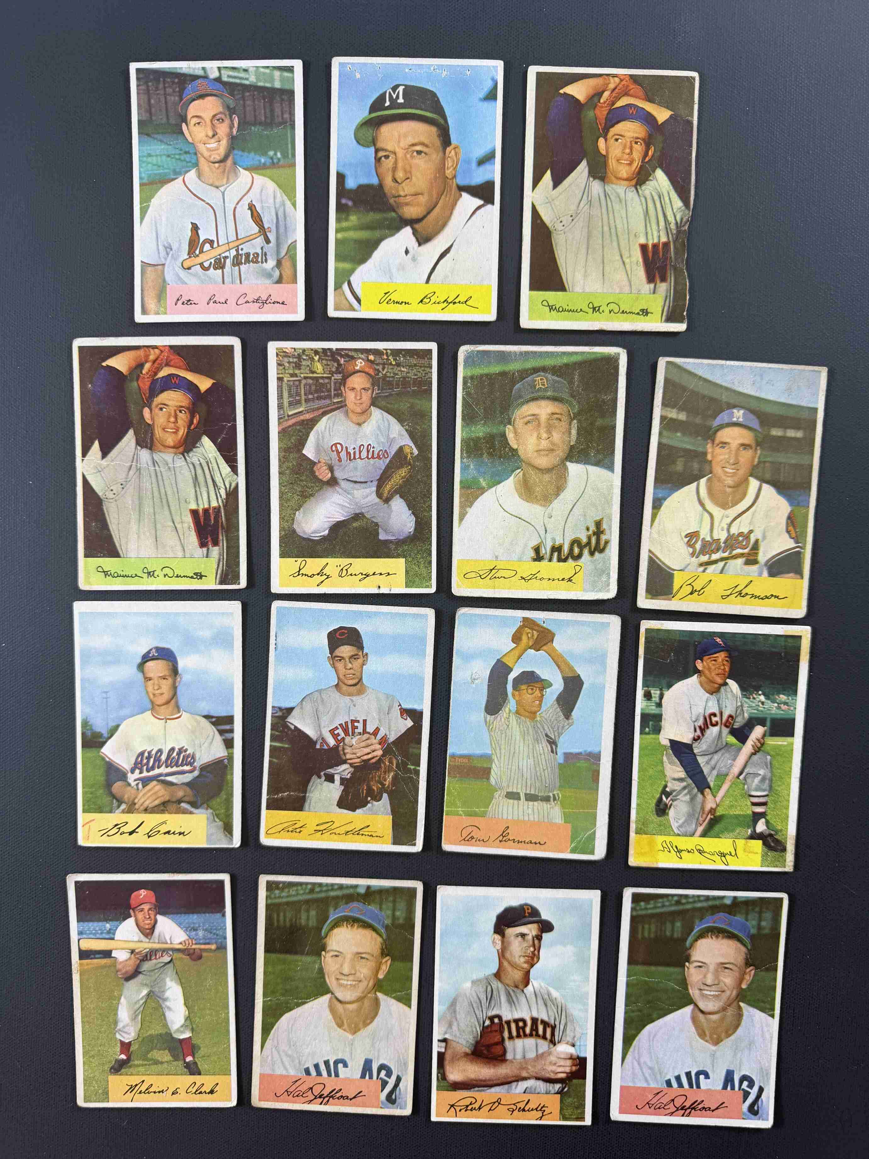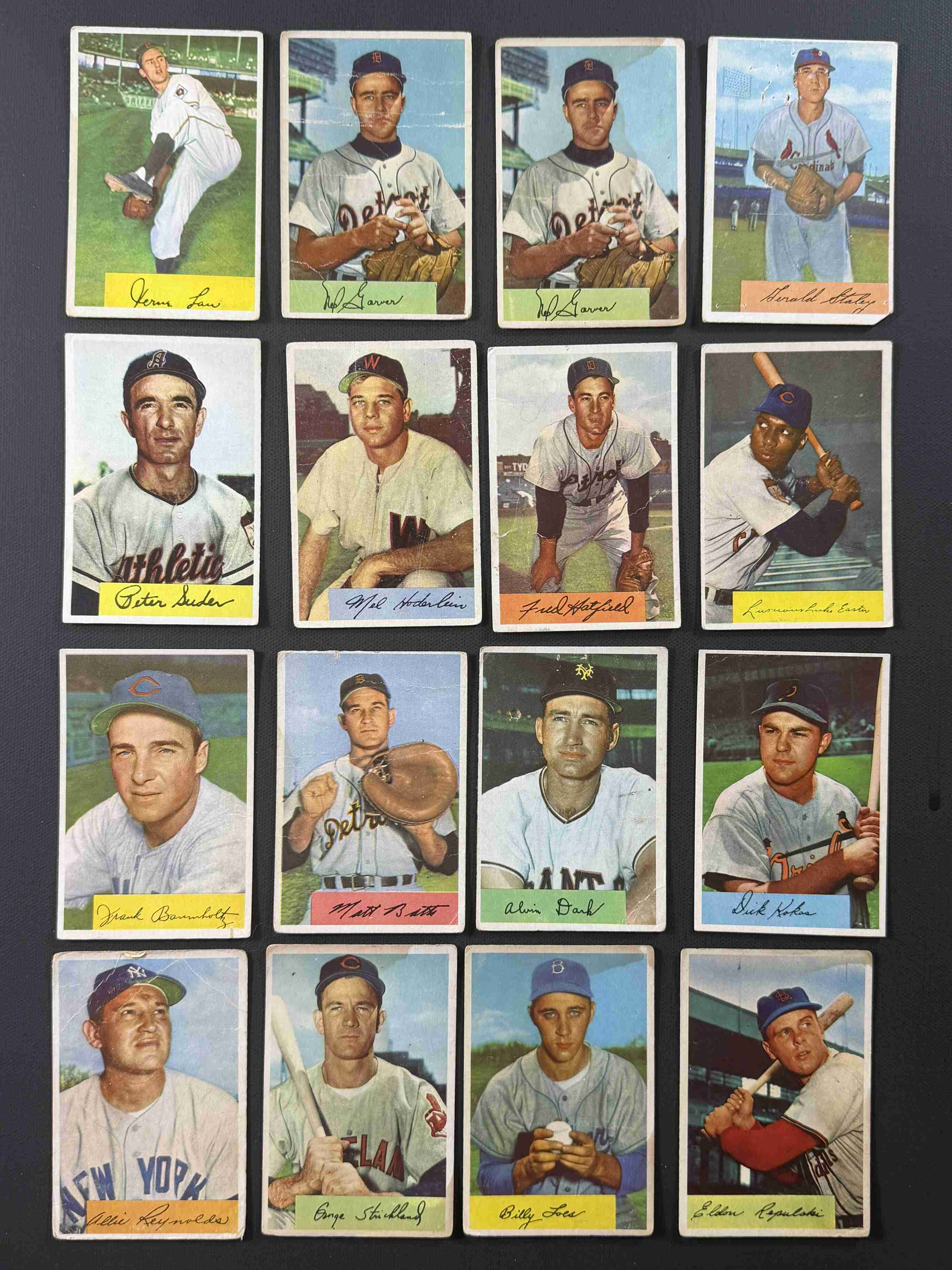 47 assorted 1954 Bowman baseball cards with duplicates. Low grade. Many different flaws in this lot. Some of the flaws exhibited on individual cards are writing, heavy creasing, piece missing, holes, paper remnants.