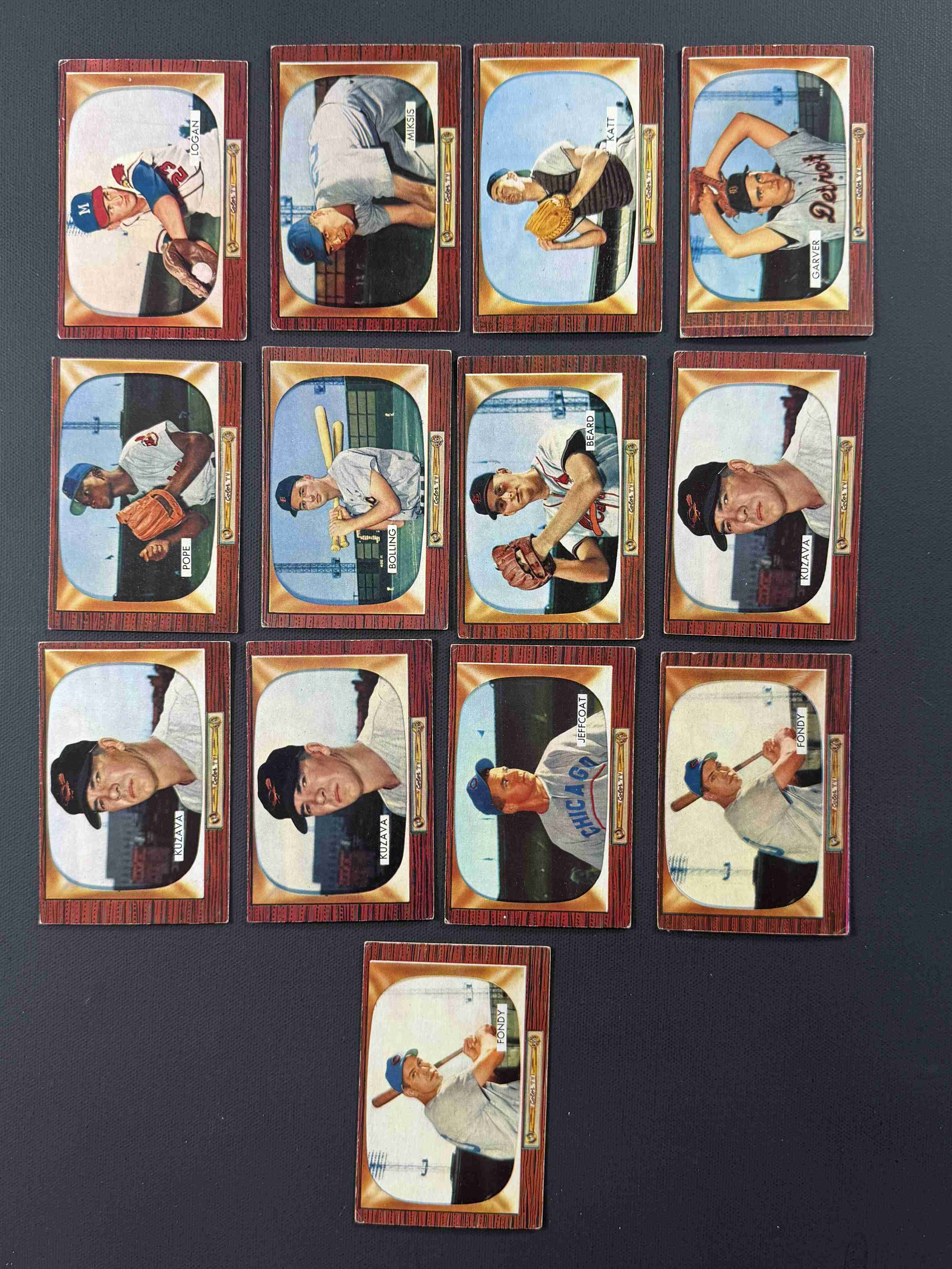 44 1955 Bowman baseball cards. Overall condition of the lot is VG. Some better and some worst. 1 card has a red pen check mark on back and one with a pencil erasure on the front. See pics for individual condition of all cards.