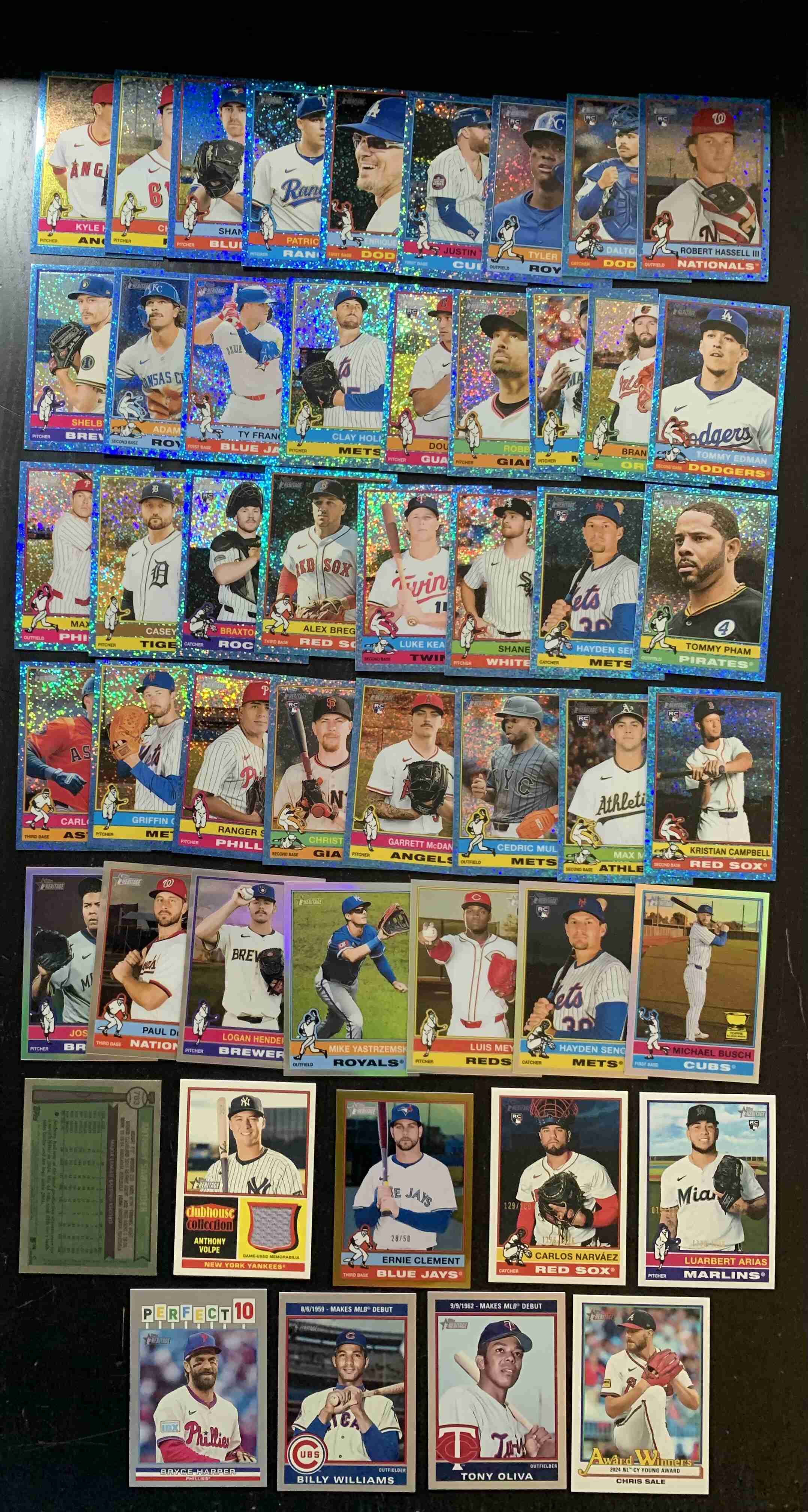 For auction is a lot of roughly 500 cards from 2025 Topps Heritage High Number. Lot breaks down as follows (all roughly) - 400 Base / 24 Chrome / 34 Chrome Blue Sparkle Refractors / 7 Chrome Refractors / 31 Blue Bordered Paper Parallels / 3 Holographic Inserts / 1 Insert / 1 High Number SP (703) / 2 Bicentennial #/200 (the Navarez is VG-EX with Imprint/Printing Issue) / 1 Relic / 1 Chrome Gold Refractor #/50. Lot includes everything pictured; anticipate multiples of some cards; Overall, cards are NM; However, there are some outliers with edge/corner bumps, etc. (including the Navarez, as stated above). Please refer to photos for more details. Cards will ship securely with tracking via USPS.